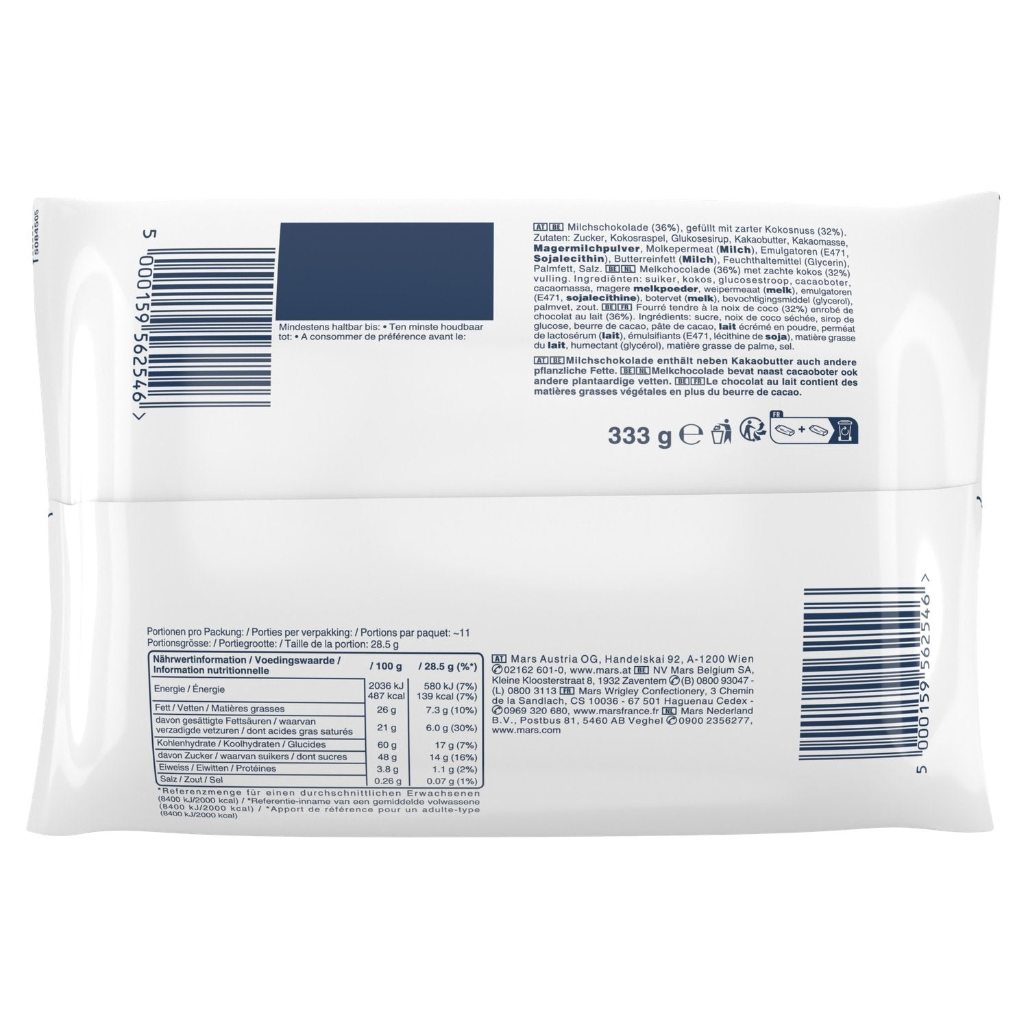 Ingrédients: sucre, noix de coco séchée, sirop de glucose, beurre de cacao, pâte de cacao, LAIT écrémé en poudre, perméat de lactosérum (LAIT), émulsifiants (E471, lécithine de SOJA), matière grasse du LAIT, humectant (glycérol), matière grasse de palme, sel.