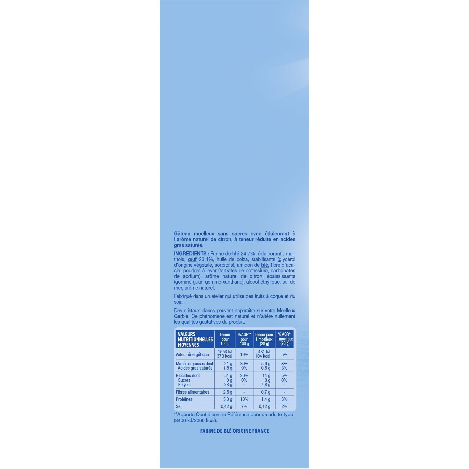 Farine de BLE 25%, édulcorant : maltitols, OEUFS 18,8%, huile de colza, stabilisants (glycérol d'origine végétale, sorbitols), amidon de BLE, fibre d'acacia, poudres à lever (tartrates de potassium, carbonates de sodium), arôme naturel de citron, épaississants (gomme guar, gomme xanthane), farine de lin, alcool éthylique, sel de mer, arôme naturel. Fabriqué dans un atelier qui utilise FRUITS A COQUE, SOJA