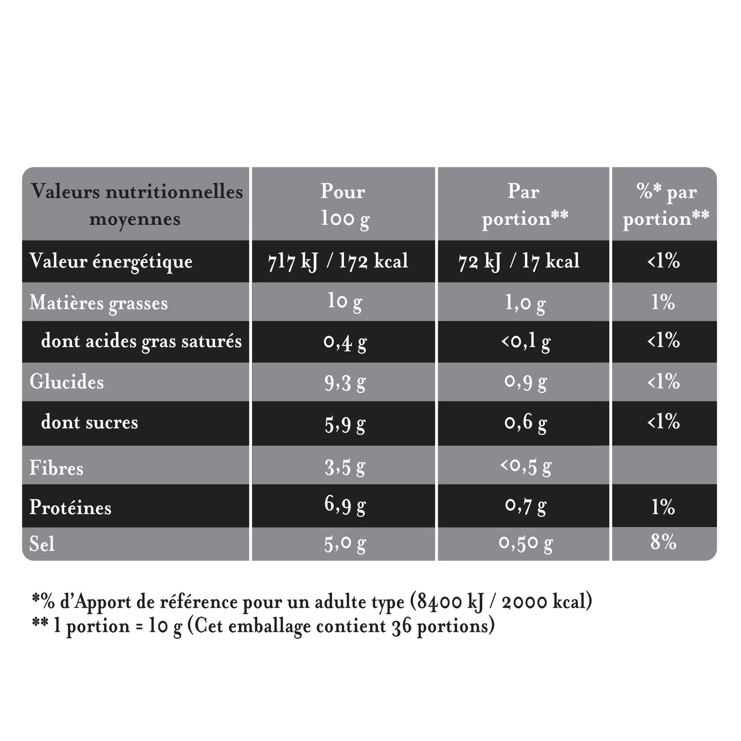 Les informations présentées (ingrédients, valeurs nutritionnelles, conseils d’utilisation, etc.) sont fournies à titre indicatif et peuvent varier selon les approvisionnements. Nous vous invitons à vérifier systématiquement les informations figurant sur l’emballage avant consommation. Photo non contractuelle – l’apparence, le conditionnement ou certains détails du produit peuvent différer de l’illustration. Le design de l'emballage est susceptible d’évoluer.