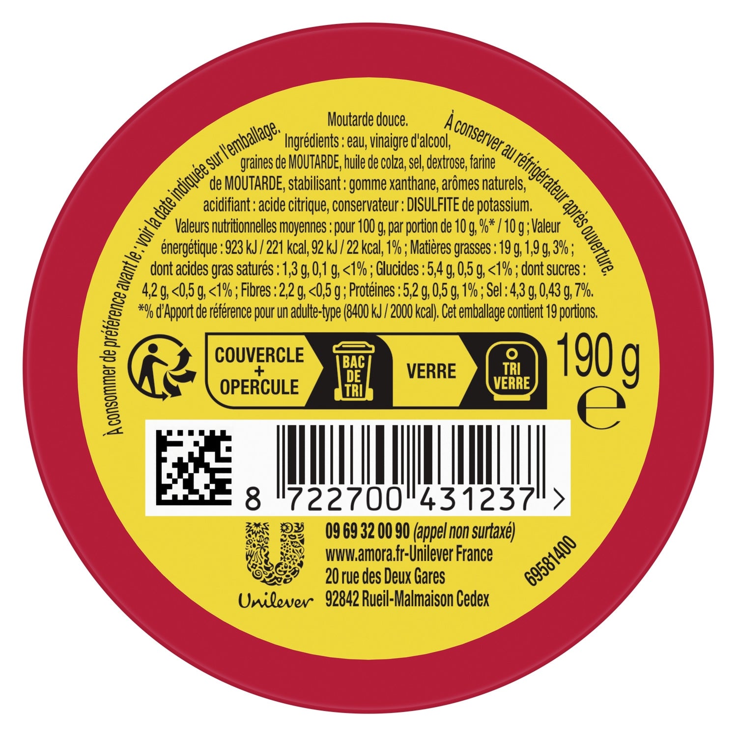 La moutarde douce Amora, préparée dans la région de Dijon*, apporte tout le bon goût de la moutarde et est adaptée aux grands comme aux petits.,Tout le goût et toute la finesse de la moutarde avec une touche légère de piquant pour réveiller délicatement les papilles.,Cette moutarde condiment est à conserver au réfrigérateur après ouverture.,Partagez ce qu'il y a de meilleur : notre recette de moutarde de caractère au goût unique et doux, appréciée par toute la famille !,L'astuce du chef : ajoutez une cuillère de moutarde fine et douce Amora à de la crème fleurette et obtenez une délicieuse recette de sauce pour vos pâtes.,Découvrez la moutarde douce dans le verre décoré iconique d'Amora à l'image de vos héros préférés.