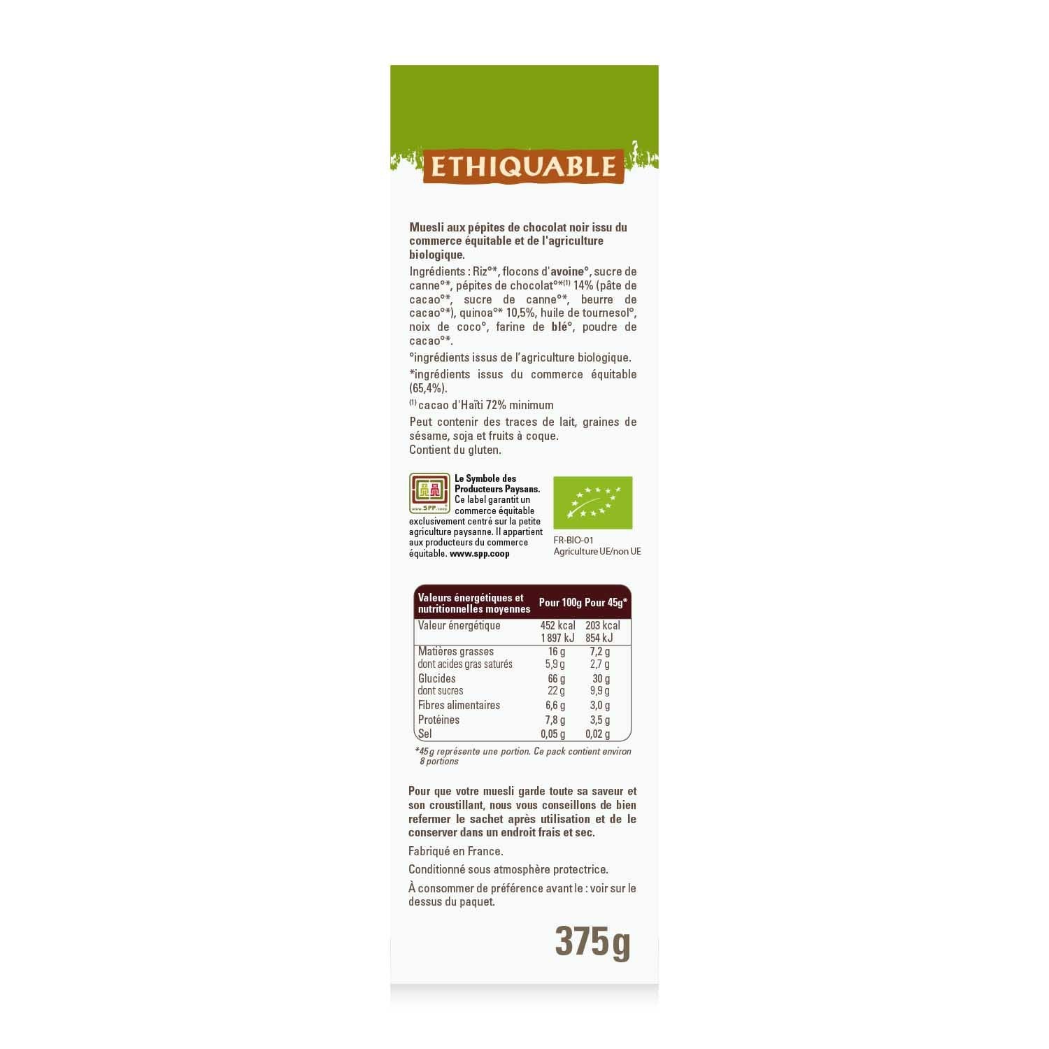 CE QUE J'AIME : Le muesli croustillant d'Ethiquable est généreux et gourmand. Très protéiné avec des flocons d'avoine BIO mais toujours gourmand avec 14% de pépites de chocolat à 72% Haïti et du quinoa soufflé ! Un régal pour le petit déjeuner. Les pépites de chocolat viennent de notre coopérative Haïtienne. Terroir sour le vent, entre le bord de mer et les reliefs. Les cacaoyers se trouvent dans les jardins créoles aux cultures diversifiées. Plus de valeur ajoutée pour les producteurs d'Haïti qui fermentent leurs fèves de cacao, étape indispensable pour obtenir un cacao fin et aromatique. En 2009, les producteurs de la FECCANO ont exporté le premier cacao biologique fermenté du pays. Plus de 10 ans de commerce équitable ont amélioré les revenus des cacaoculteurs et permis à l'origine Haïti d'être reconnue dans le monde du cacao. Cultivé sans pesticides, ni produits chimiques. Culture à taille humaine. Prix équitable rémunérateur et achat direct. Projet de commerce équitable à impact. Transformé et conditionné en France. -> Plus de valeur ajoutée pour les producteurs