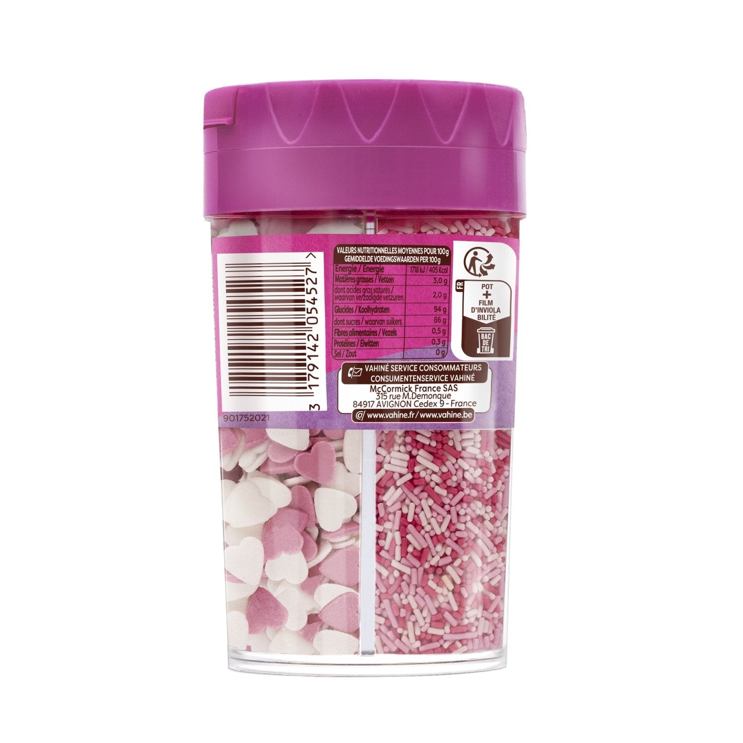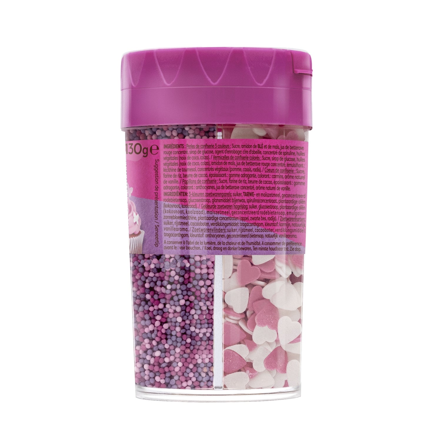 Ingrédients : perles de confiserie 3 couleurs : sucre, amidon de BLE et de maïs, jus de betterave rouge concentré, sirop de glucose, agent d'enrobage: cire d'abeille, concentré de spiruline, huiles végétales (noix de coco, colza). / vermicelles de confiserie colorés : sucre, sirop de glucose, huiles végétales (noix de coco, colza), amidon de maïs, jus de betterave rouge concentré, émulsifiant : lécithine de tournesol, concentrés végétaux (pomme, cassis, radis). / coeurs de confiserie : sucre, farine de riz, beurre de cacao, épaississant : gomme adragante, colorant : carmins, arôme naturel de vanille. / papillons de confiserie : sucre, farine de riz, beurre de cacao, épaississant : gomme adragante, colorant : anthocyanes, jus de betterave concentré, arôme naturel de vanille.
