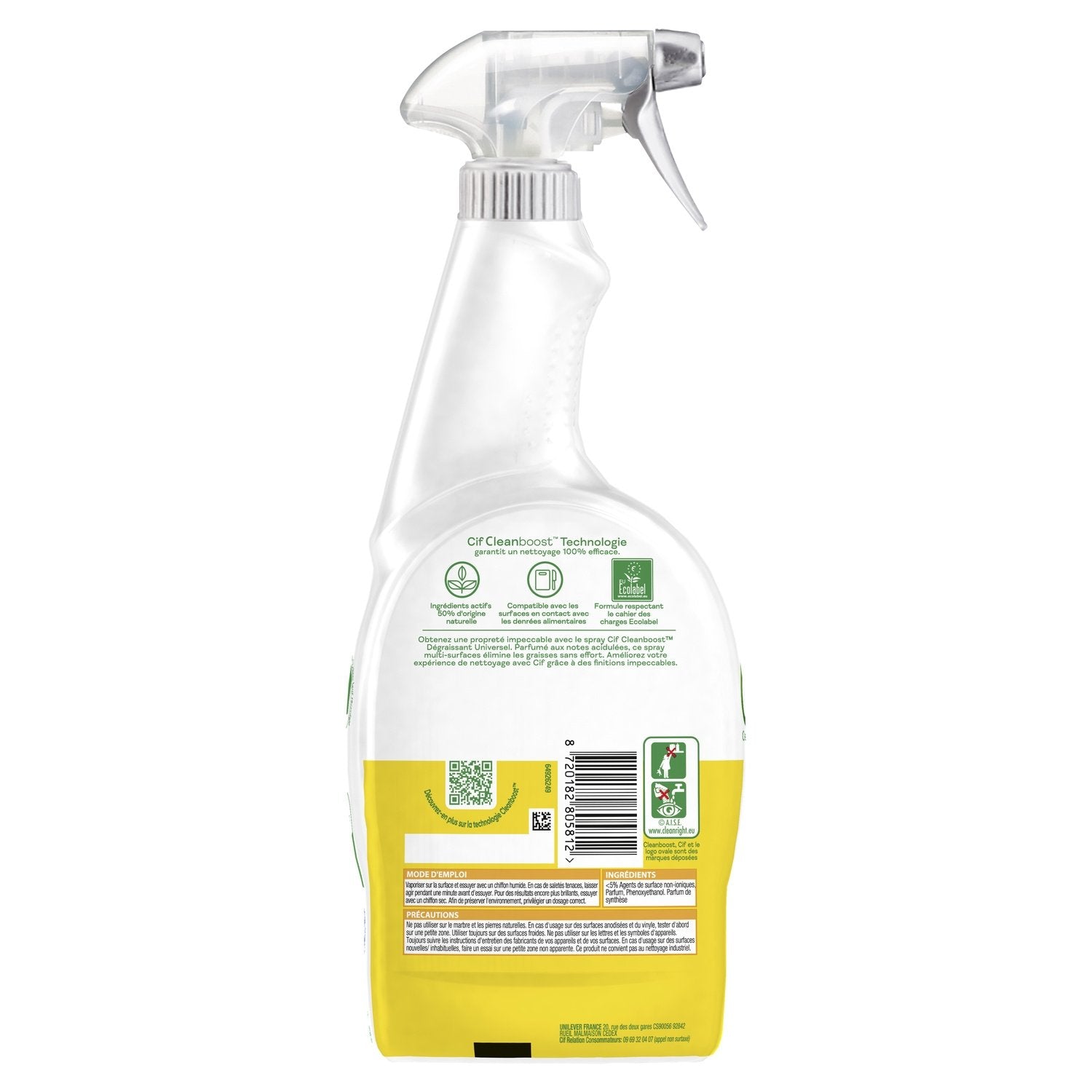 Le spray nettoyant Cif Dégraissant Universel est idéal pour enlever toutes les taches de graisses du quotidien.,Avec du bicarbonate, ce pistolet spray nettoyant enlève les graisses tenaces sans efforts.,Ce spray multi-surfaces garantit un nettoyage 100% efficace de vos plaques de cuisson, hottes et micro-ondes, tout en étant compatible avec les surfaces en contact avec les denrées alimentaires.,Avec 50 % d'ingrédients actifs d'origine naturelle, ce pistolet est pratique et efficace pour une hygiène irréprochable et pour nettoyer toutes les taches de graisses sans rayer vos surfaces.,Le parfum aux notes acidulées de ce spray désinfectant laisse une odeur fraiche dans votre maison.,Cif s'engage pour la planète en proposant un nettoyant multi-usages efficace tout en respectant le cahier des charges Ecolabel.