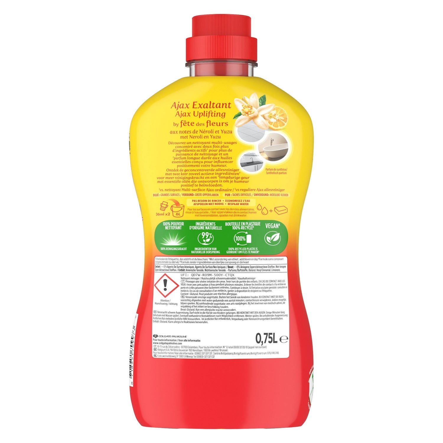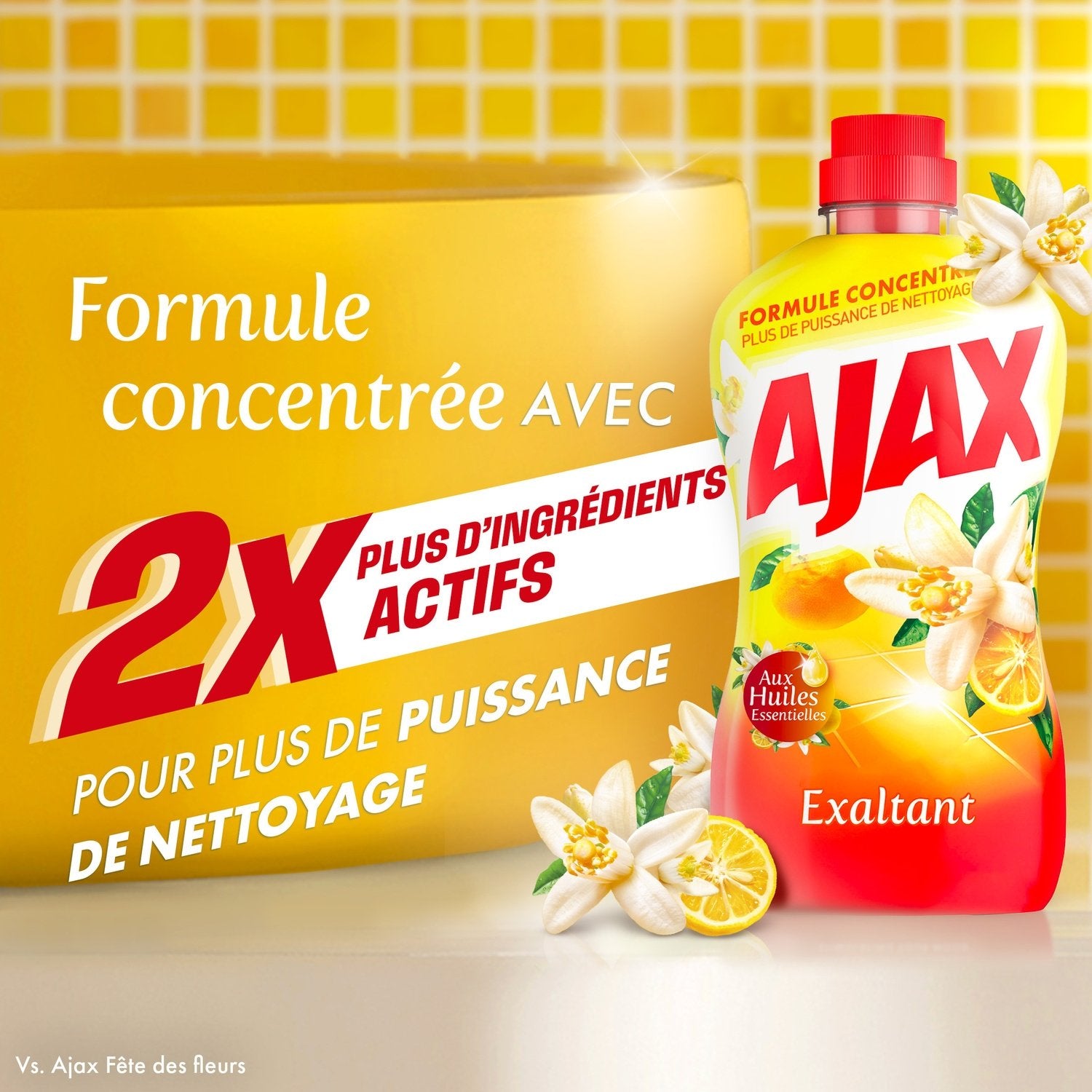Parfum longue durée aux huiles essentielles conçu pour avoir un impact positif sur votre humeur.,Plus de pouvoir nettoyant avec deux fois plus d'ingrédients actifs par rapport au nettoyant multi-usages Ajax classique.,Offre le pouvoir nettoyant Ajax à 100% pour des surfaces éclatantes à chaque nettoyage.,Le nettoyant multi-usage peut être utilisé dans toute votre maison.,Formulé avec 99% d'ingrédients d'origine naturelle.