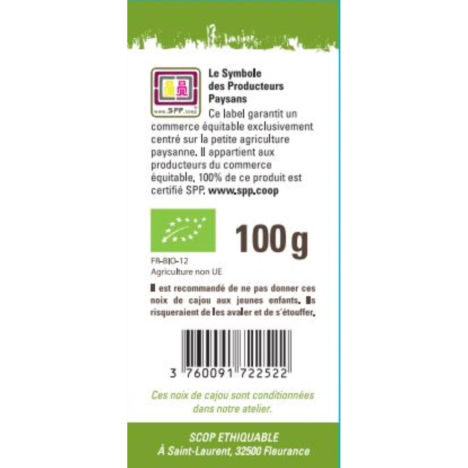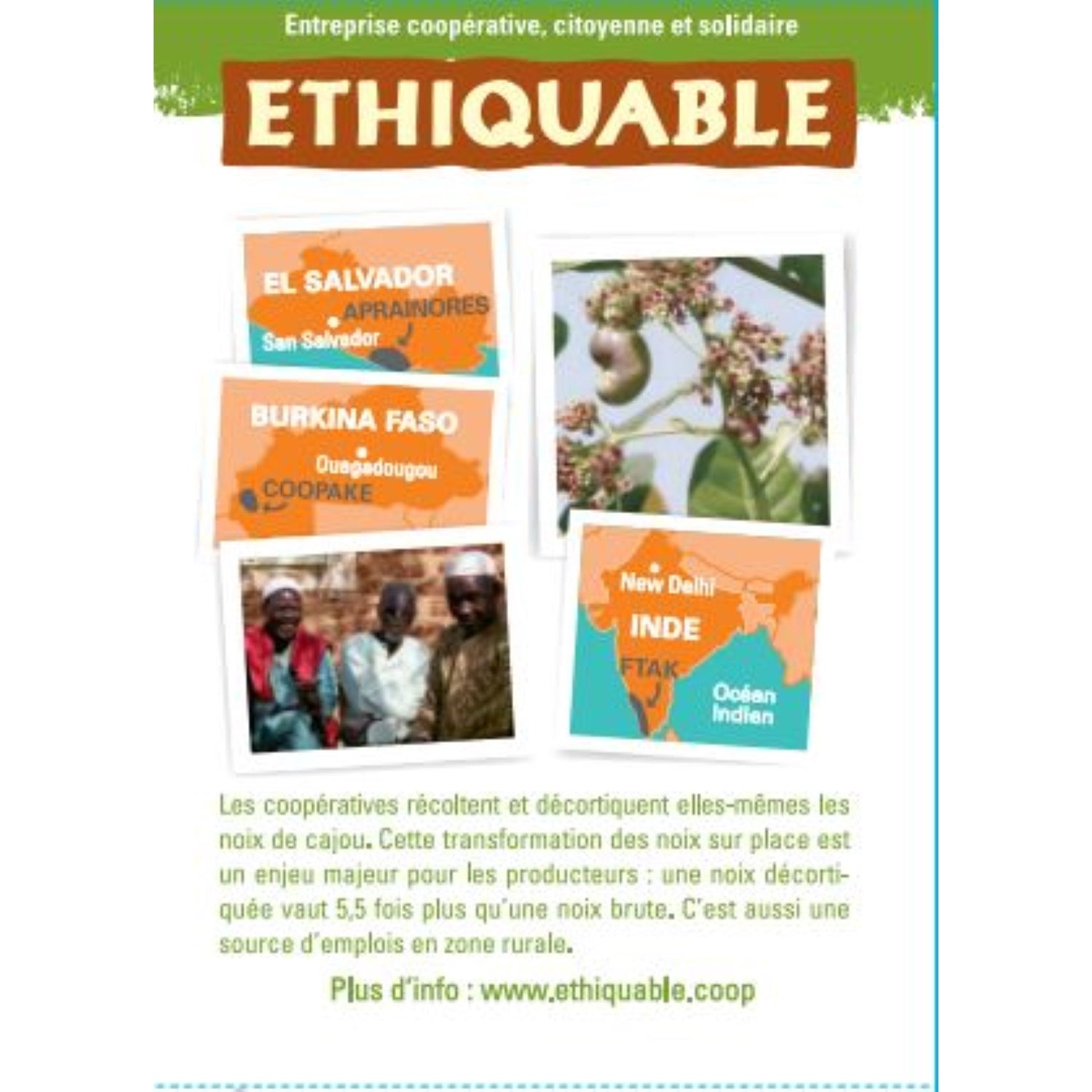 CE QUE JE CROQUE :Ces noix de cajou grillées et sans sel sont issues de l'agriculture biologique et du commerce équitable. Naturellement riches en nutriments, elles sont torréfiées sans matières grasses ajoutées, ni sel, pour préserver leur saveur authentique. Parfaites pour un apéro gourmand et sain, elles sont aussi idéales pour combler une petite faim ou agrémenter vos plats préférés. En fonction des récoltes, ces cajous proviennent de trois coopératives de petits producteurs au Sénégal, au Burkina Faso et au Salvador. Cultivées sans pesticides, ni produits chimiques, elles sont achetées directement à un prix rémunérateur et contribuent à des projets locaux de commerce équitable à impact. Elles affichent une traçabilité totale : récoltées et décortiquées par les producteurs, puis importées et conditionnées dans le Gers par la Scop Ethiquable. CE QUE JE DÉFENDS : UNE FILIÈRE MAÎTRISÉE PAR LES PRODUCTEURS La transformation locale par les coopératives de producteurs est un enjeu économique majeur : elles vendent leurs noix décortiquées 5,5 fois plus cher qu'une noix brute. C'est aussi un enjeu écologique qui permet de réduire le transport de 73% par rapport à une noix de cajou non bio produite en Afrique, décortiquée en Asie et consommée en France. Cultivé sans pesticides, ni produits chimiques Culture à taille humaine Prix équitable rémunérateur et achat direct Projet de commerce équitable à impact Traçabilité et transparence des origines : Sénégal, Burkina Faso, Salvador en fonction des récoltes Filière courte : récolté et décortiqué par les producteurs, importé et conditionné dans notre atelier dans le Gers -> Plus de valeur ajoutée pour les producteurs -> Moins de transport Pour un apéritif convivial, gourmand et sain Parfait pour concocter des recettes sucrées ou salées en cuisine Parfaites pour les petits creux avec un apport nutritionnel intéressant Format idéal pour la randonnée, les ballades et les pique-niques
