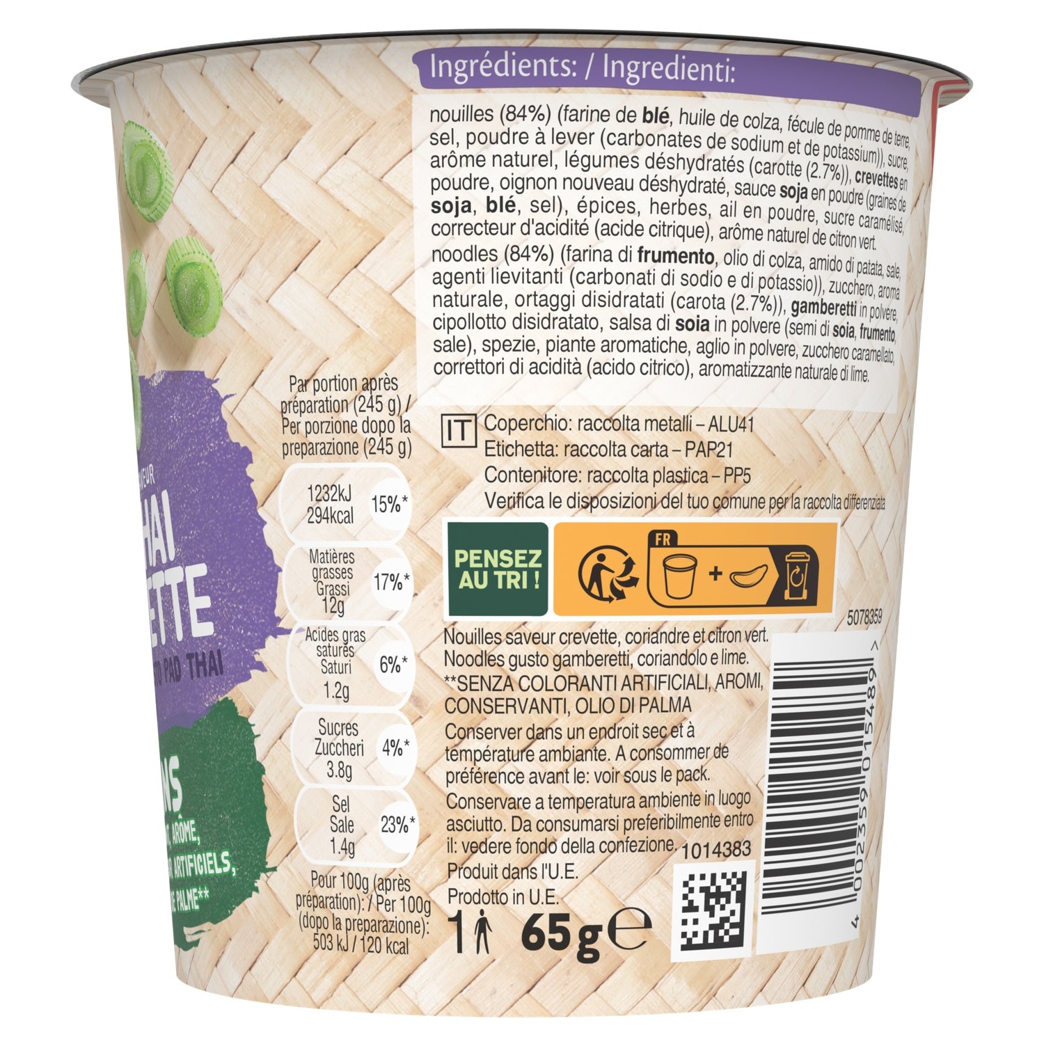 Ingrédients: nouilles (84%) (farine de BLÉ, huile de tournesol, fécule de pomme de terre, sel, poudre à lever (carbonate de sodium, carbonate de potassium)), sucre, arôme naturel, légumes déshydratés (carotte (2.7%)), CREVETTES en poudre, oignon nouveau déshydraté, sauce SOJA en poudre (graines de SOJA, BLÉ, sel), épices, herbes, ail en poudre, sucre caramélisé, correcteur d'acidité (acide citrique), arôme naturel de citron vert.