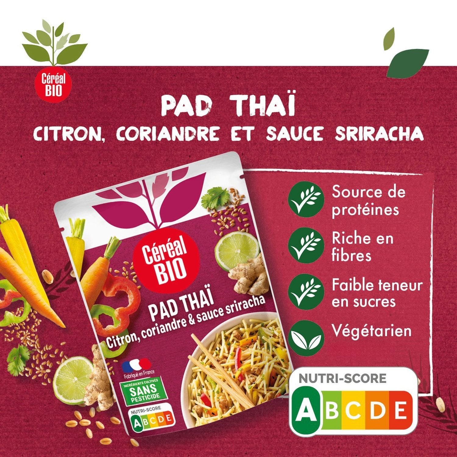 Spécialité céréalière cuisinée aux légumes, façon pad thai, issue de l'agriculture biologique