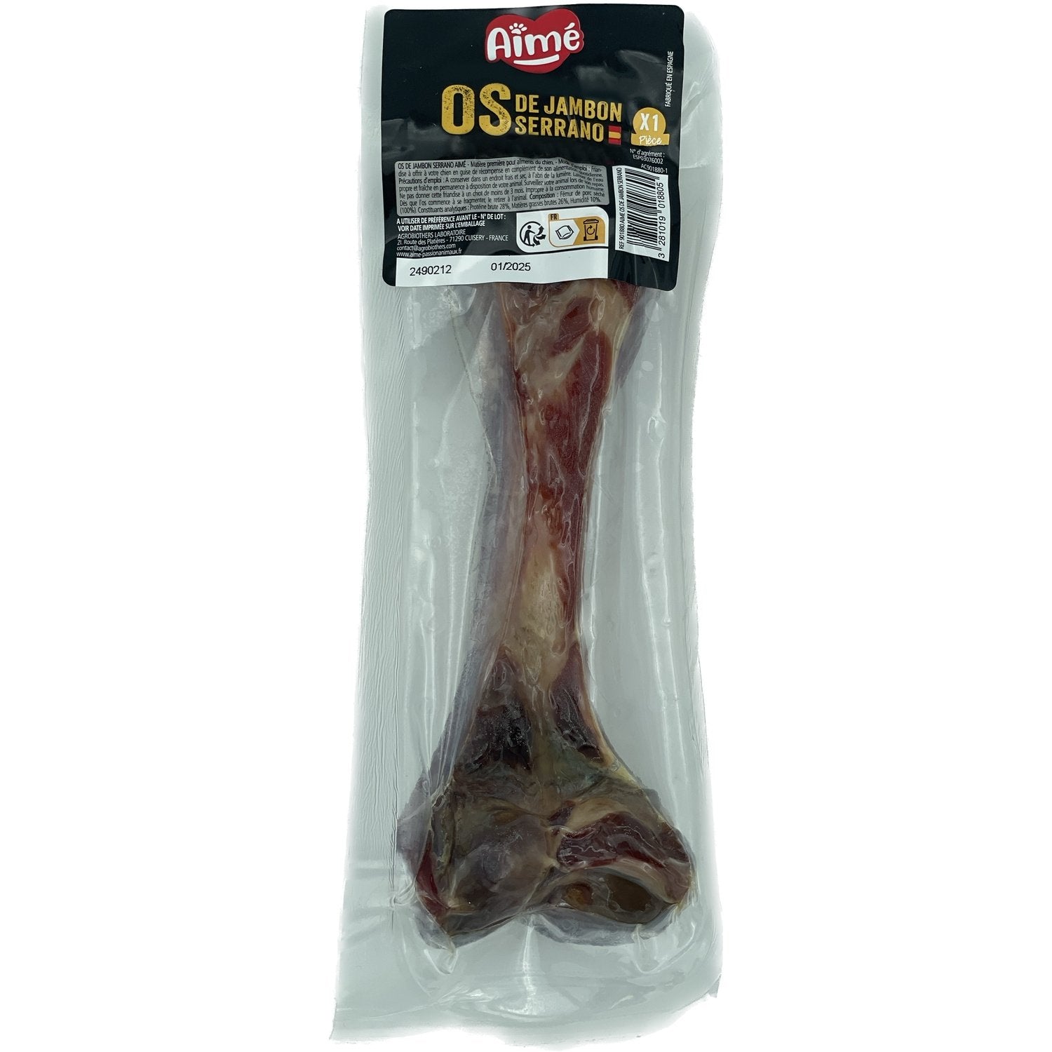 Ce os de jambon serrano, garni de délicieux morceaux de viande, sera une récompense savoureuse pour votre chien. Une friandise saine, 100% naturelle, sans conservateur, ni colorant. En plus d'être une friandise gourmande appréciée, cet os permet aussi d'entretienir ses dents. Cet os , emballé sous vide, sera facile à conserver chez vous. Un os de jambon vendu par sachet. Laissez de l'eau fraîche et propre en permanence à disposition de votre animal. Surveillez votre animal lors de son repas. Testé et adopté par Snow.