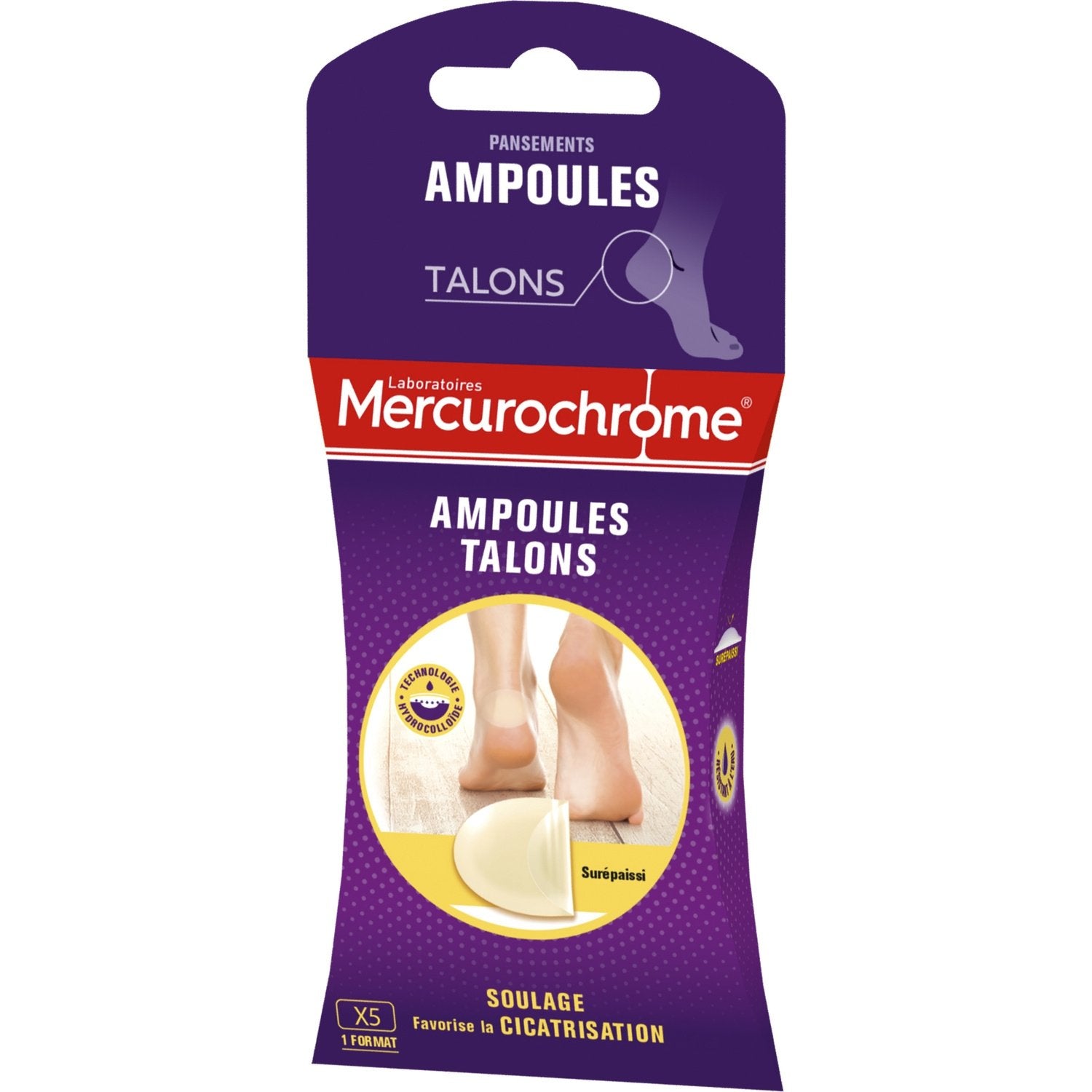Grâce à leur technologie hydrocolloïde, les Pansements Ampoules des Laboratoires Mercurochrome® soulagent la douleur lors de l'apparition de l'ampoule et facilitent la cicatrisation. • Technologie hydrocolloïde : au contact de l'ampoule, la masse hydrocolloïde forme un gel favorisant la cicatrisation des ampoules : elle crée un milieu humide dermo-reconstituant qui protège la plaie. • Bords amincis effet seconde peau : apportent souplesse et discrétion au pansement pour une protection optimale