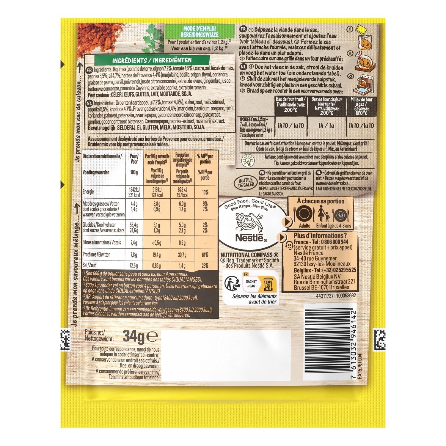 Idéal pour réussir à coup sûr un poulet délicieux, tendre et juteux.,Sans ajouter de matière grasse.,Sans colorant. La couleur provient du mélange des ingrédients.,Inutile de saler votre poulet.,Un grand sac spécialement conçu pour la cuisson du poulet au four.
