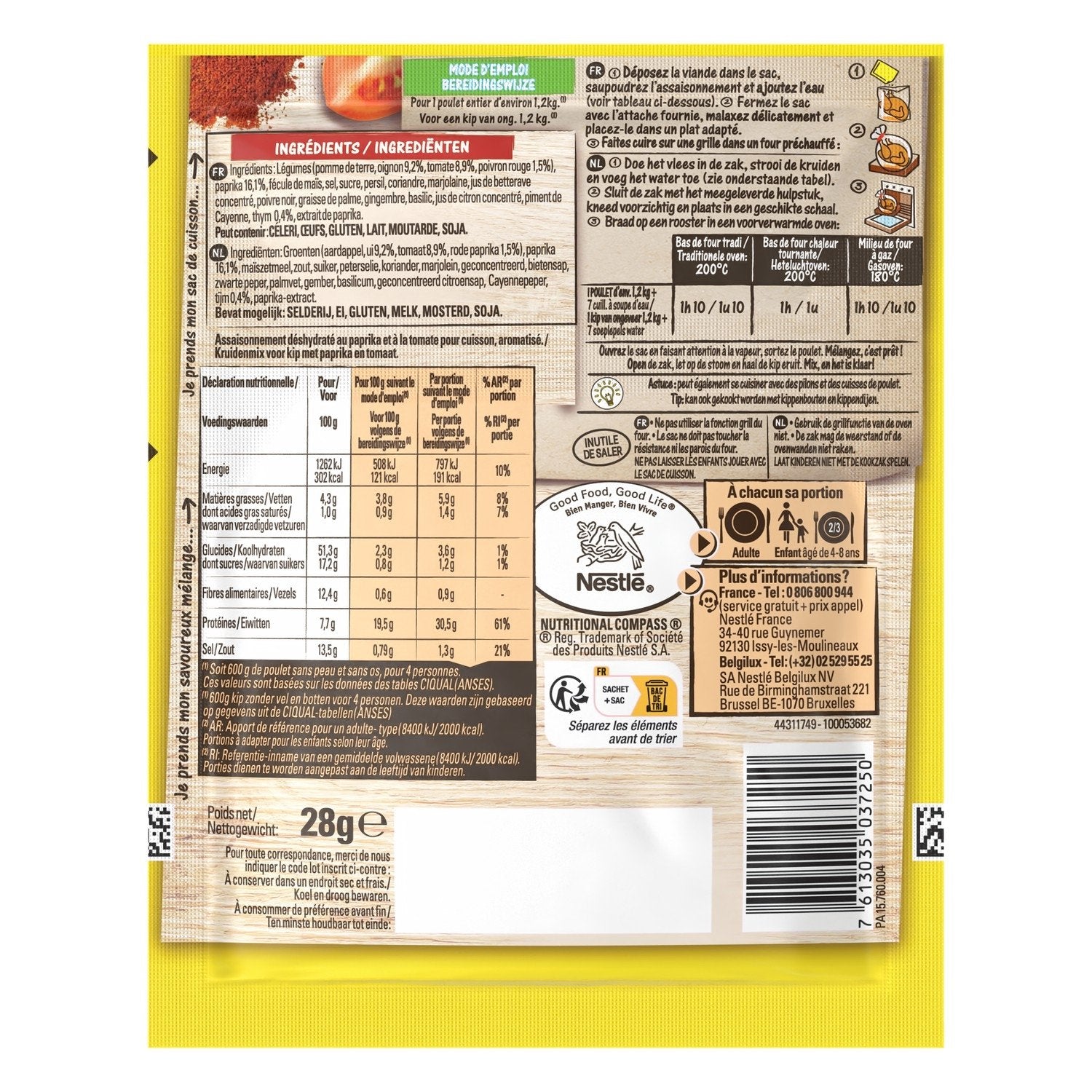 Idéal pour réussir à coup sûr un poulet délicieux, tendre et juteux.,Sans ajouter de matière grasses.,Sans colorant. La couleur provient du mélange des ingrédients.,Inutile de saler votre poulet,Un grand sac spécialement conçu pour la cuisson du poulet au four.