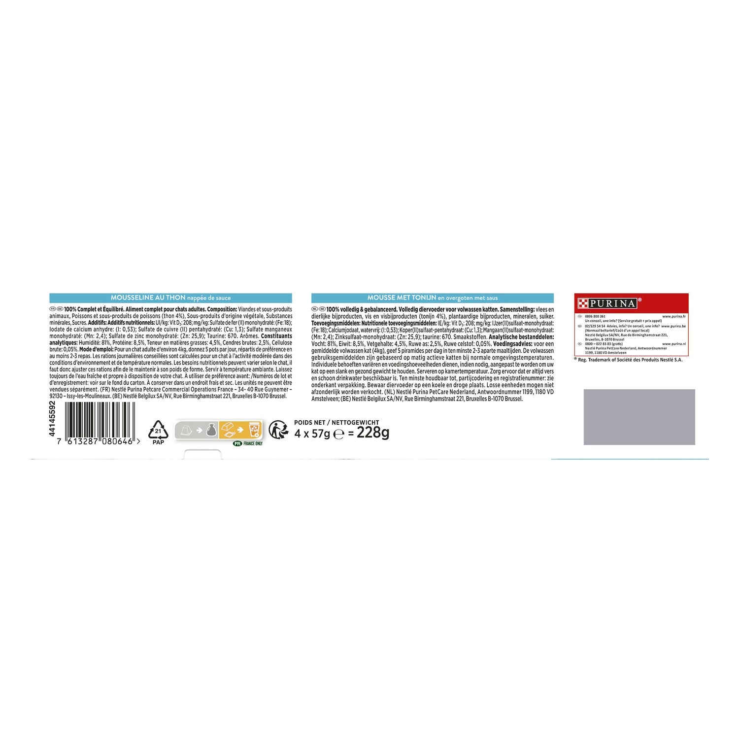 Aliment complet pour chats adultes,4 portions Individuelles,Des mousselines délicates et raffinées nappées de sauce,Élaborée avec des ingrédients de haute qualité,Sans colorants. Sans conservateurs et arômes artificiels ajoutés,Conçu pour être recyclable Tous les éléments de cet emballage sont conçus pour être recyclable,Mousseline au Thon nappée de sauce