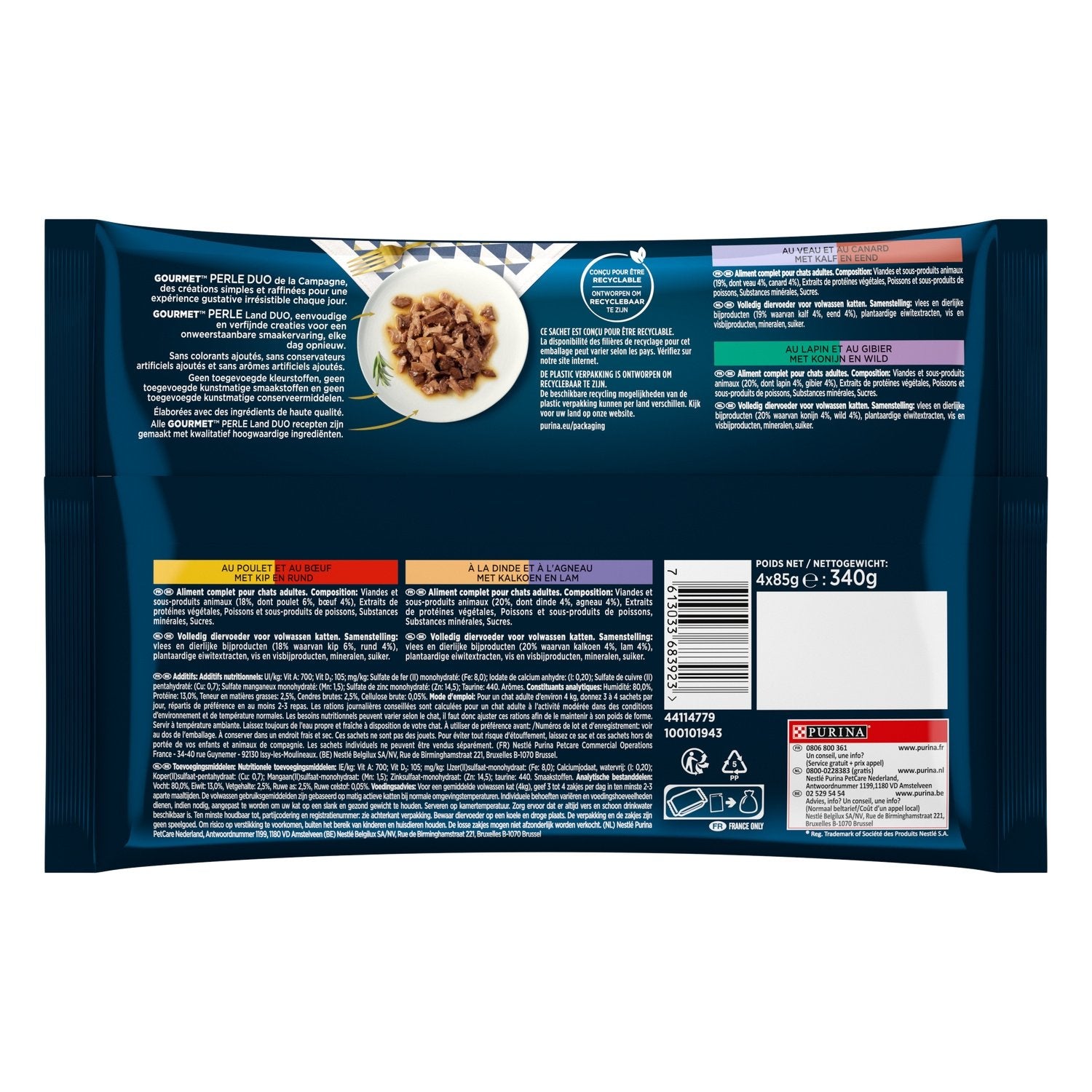 Votre chat est un véritable amateur de Viandes ou Poissons, et vous aimez lui faire plaisir en lui offrant de délicieuses recettes, élaborées avec des ingrédients simples et de haute qualité. C'est la raison pour laquelle GOURMET a créé PERLE Duo : de subtiles associations de bouchées finement découpées en effilés, au Poulet et au Bœuf, au Saumon et au Poisson blanc, ou d'autres saveurs exquises. Elles sont délicatement saisies et servies dans leur savoureuse Sauce pour ravir le palais délicat de votre chat. Toutes les recettes GOURMET PERLE Duo sont élaborées avec des ingrédients de haute qualité et sont sans colorants ajoutés, sans conservateurs artificiels ajoutés et sans arômes artificiels ajoutés. GOURMET PERLE Duo, une double tentation pour ravir les amateurs de Viandes ou de Poissons chaque jour.