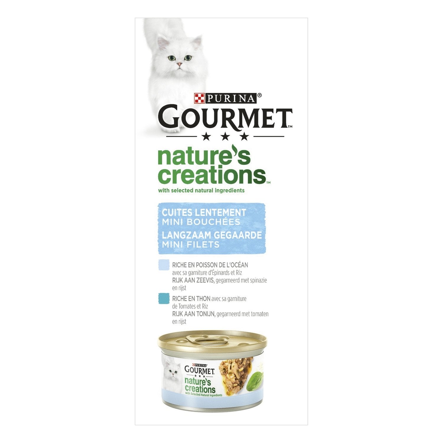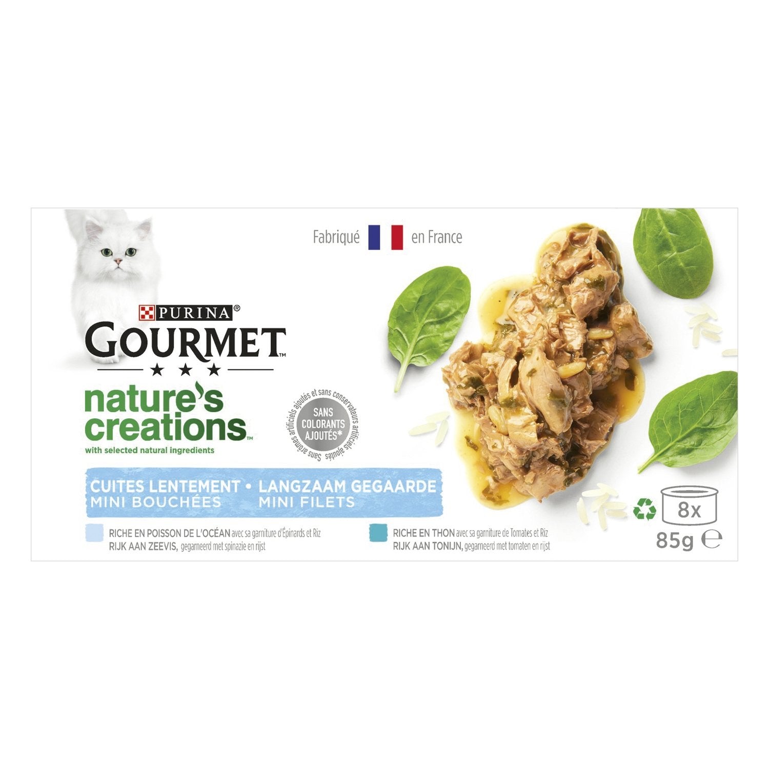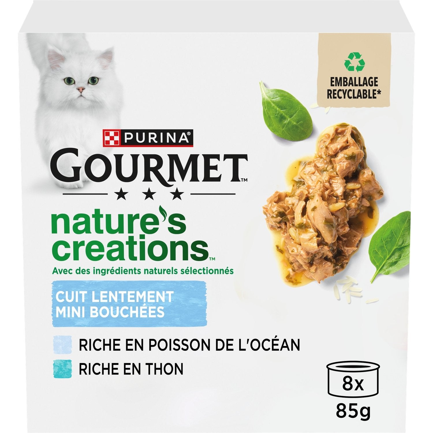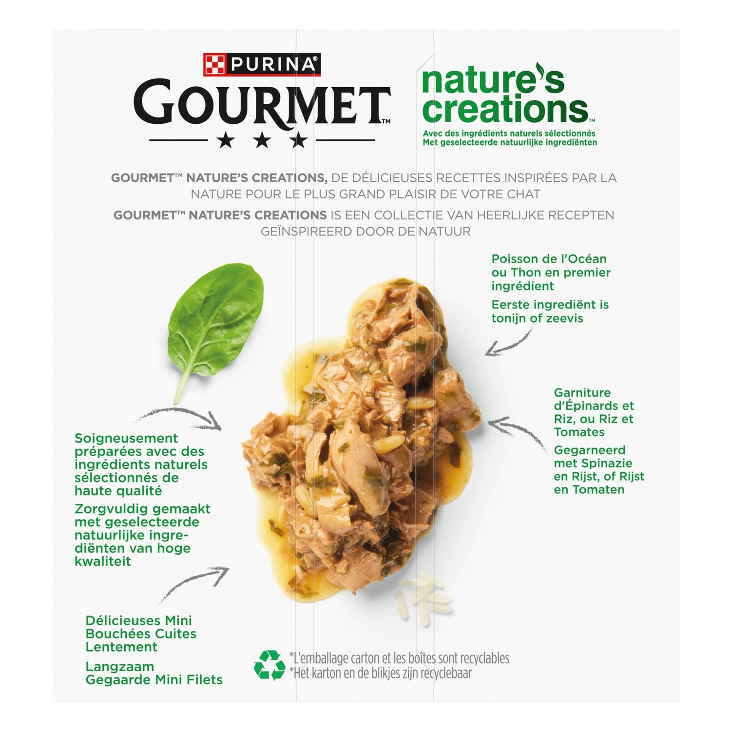 GOURMET™ Nature's Creations propose de délicieuses recettes inspirées par la nature. Nos recettes soigneusement préparées avec des ingrédients naturels sélectionnés de haute qualité sont cuites avec un grand soin pour des repas exquis. Riche en bœuf, agneau, volaille ou poisson et accompagnée de légumes tels que des épinards, des carottes, des tomates et du riz. Nos recettes sont élaborées pour que votre fin connaisseur savoure chaque bouchée avec plaisir et délice. GOURMET™ Nature's Creations. De délicieux repas inspirés par la nature.