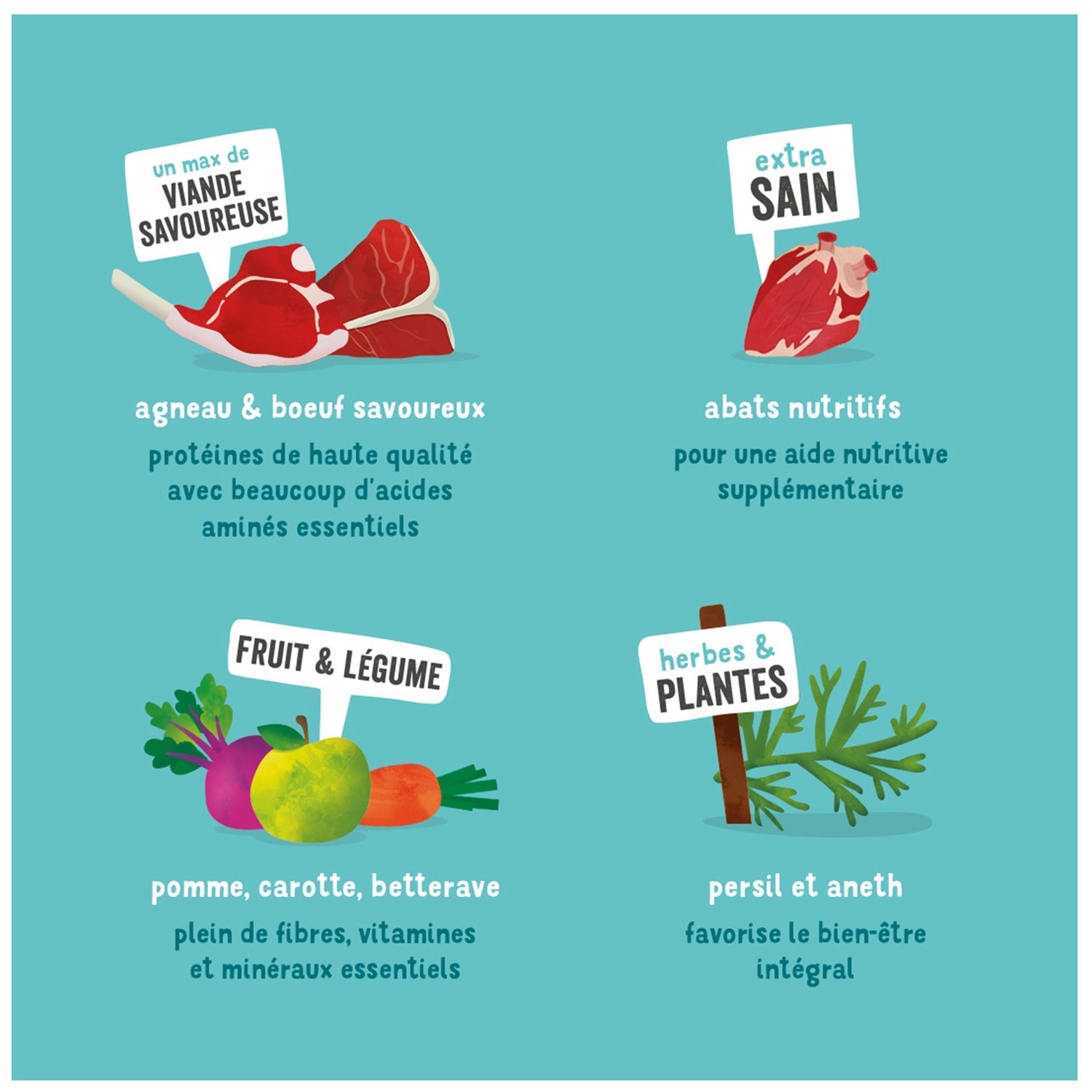 Avec un max d'agneau et de bœuf délicieux, cette recette sans céréales est bourrée de protéines de qualité supérieure qui vont aider votre chien à rester au top de sa forme. Le bœuf en particulier est une bonne source d'amino-acides essentiels. De plus, nous combinons la viande avec des abats nobles (tels que le cœur et le foie) pour une dose de nutriments supplémentaire. Nos recettes incluent également un mélange super équilibré de fruits et de légumes, et des herbes et des végétaux qui boostent encore leur apport nutritionnel. Enfin, nous les cuisons en douceur pour préserver leurs saveurs et leurs bienfaits.