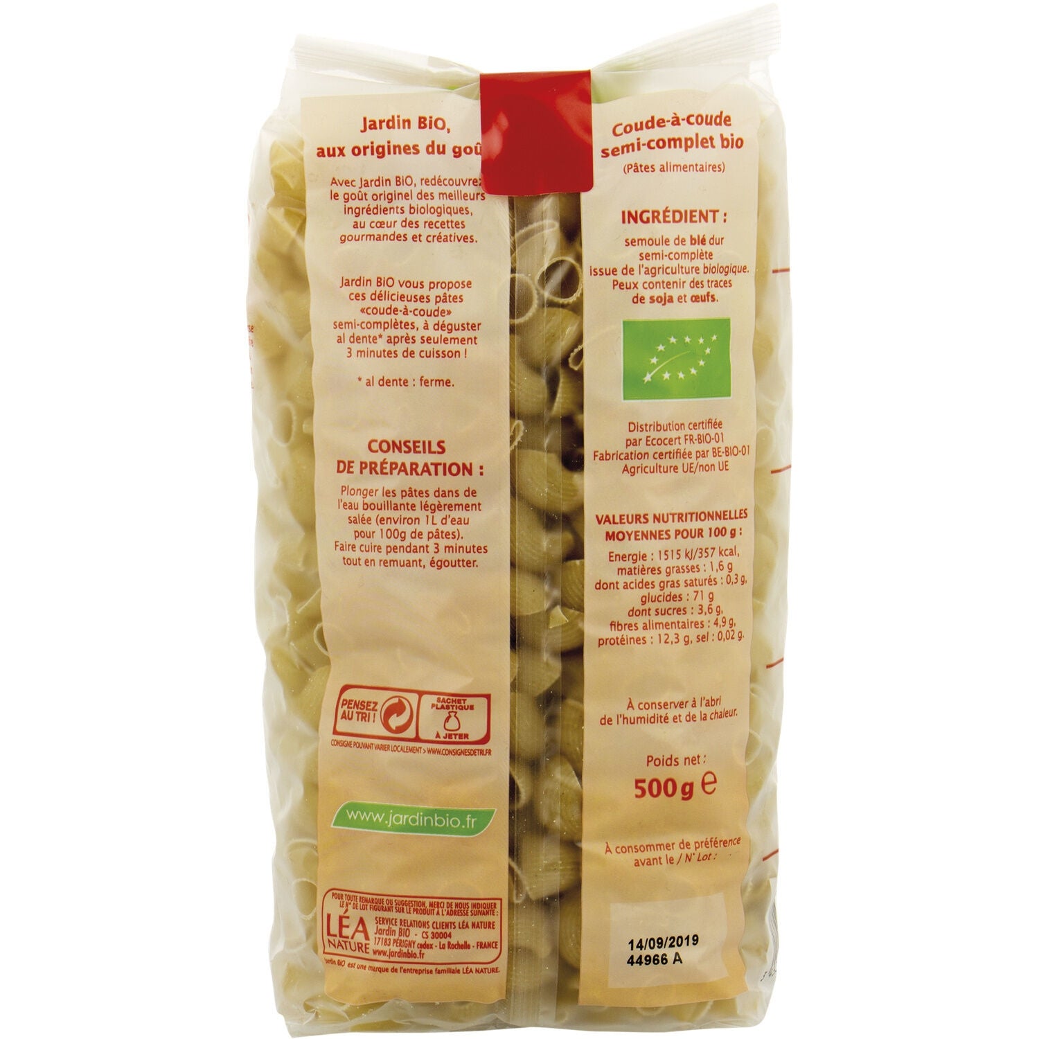 DétailsCoude-à-coude semi-complets bio (Pâtes alimentaires) Poids unitaire : 600 grs Code-barres EAN : 3456300002522 Marque : JARDIN BIO ETIC