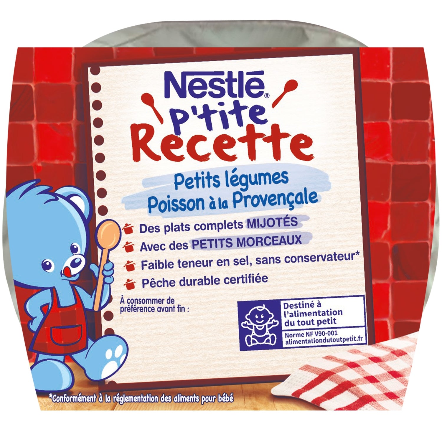 Une texture adaptée avec des petits morceaux,Cuisiné en France,Poisson issu d'une pêche durable certifiée,Faible teneur en sel,Sans conservateur*,*Conformément à la réglementation sur les aliments pour bébés **Notre poisson est du colin ou du merlu en fonction de la pêche
