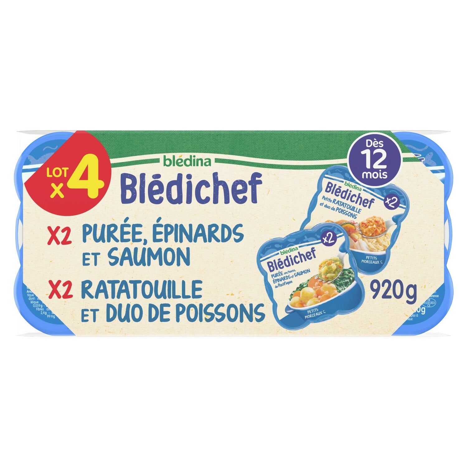 BLEDICHEF 230g Petite Ratatouille et Duo de Poissons Dès 12 mois : Plat à base de légumes et de poisson adapté à bébé. BLEDICHEF 230g Purée onctueuse, Epinards et Saumon du Pacifique Dès 12 mois : Plat à base de légumes et de poisson adapté à bébé.
