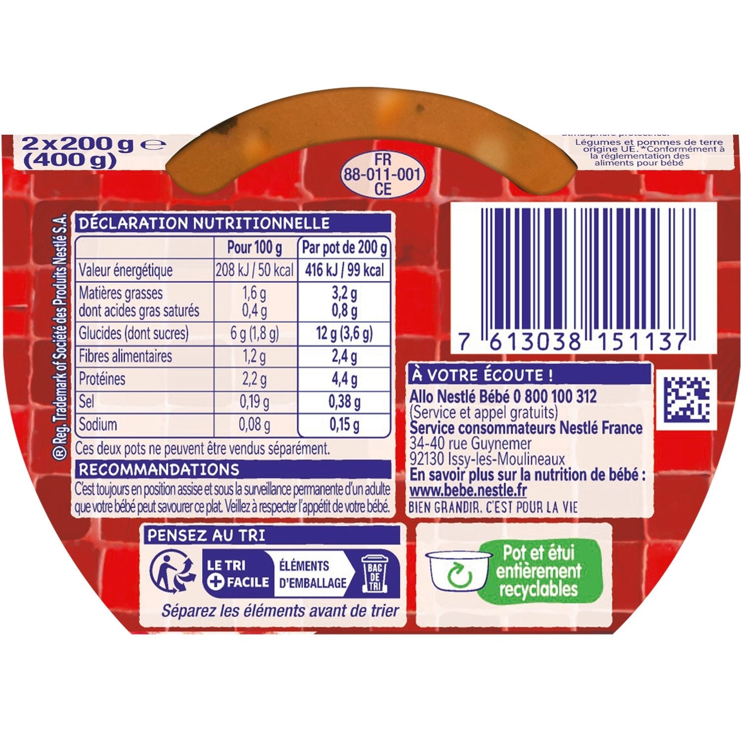 Un petit pot pour bébé dès 12 mois avec des petits morceaux,Cuisiné en France,Faible teneur en sel Sans conservateur*,Viande française.,*Conformément à la réglementation sur les aliments pour bébé.**Calculé sur le poids du pot avec son couvercle.,