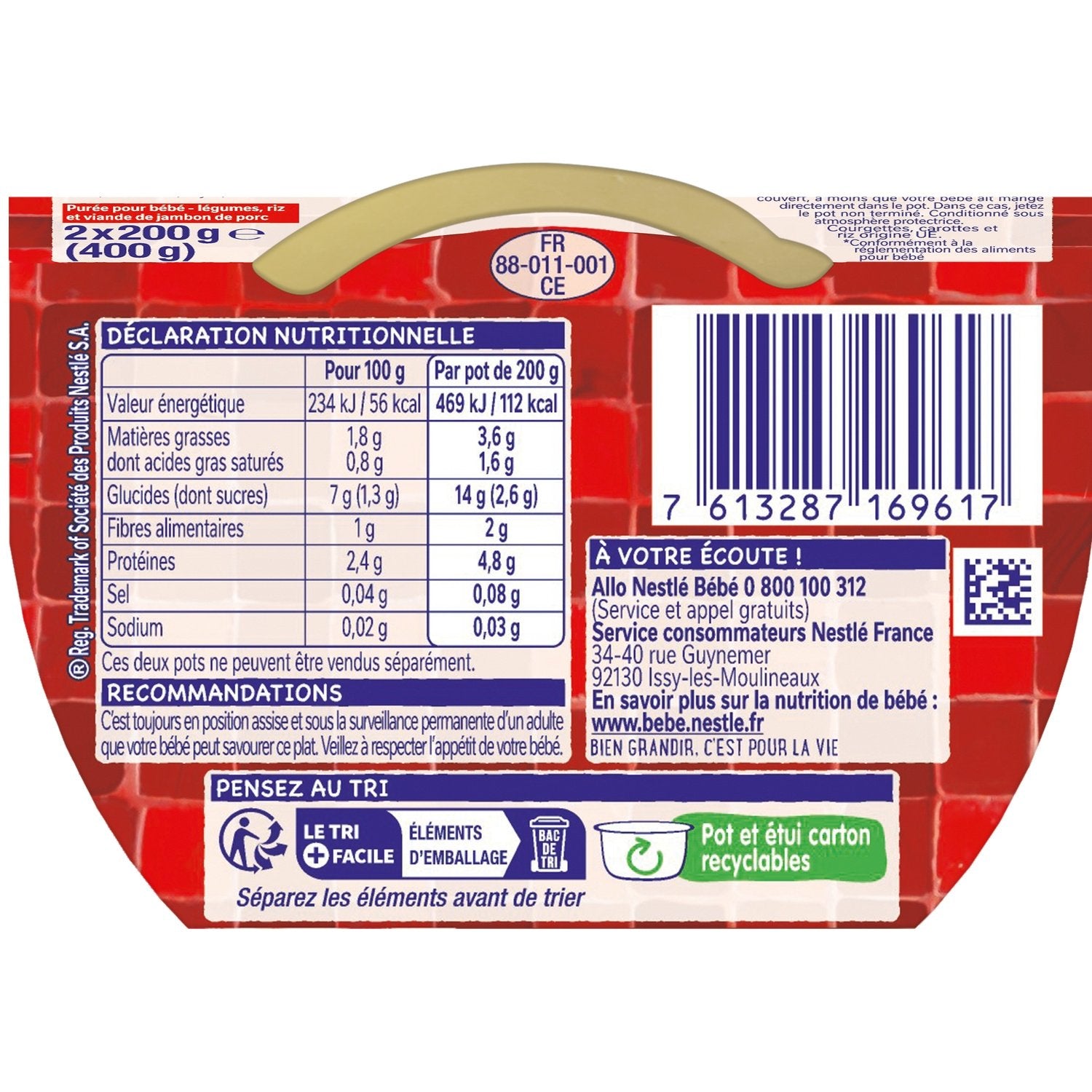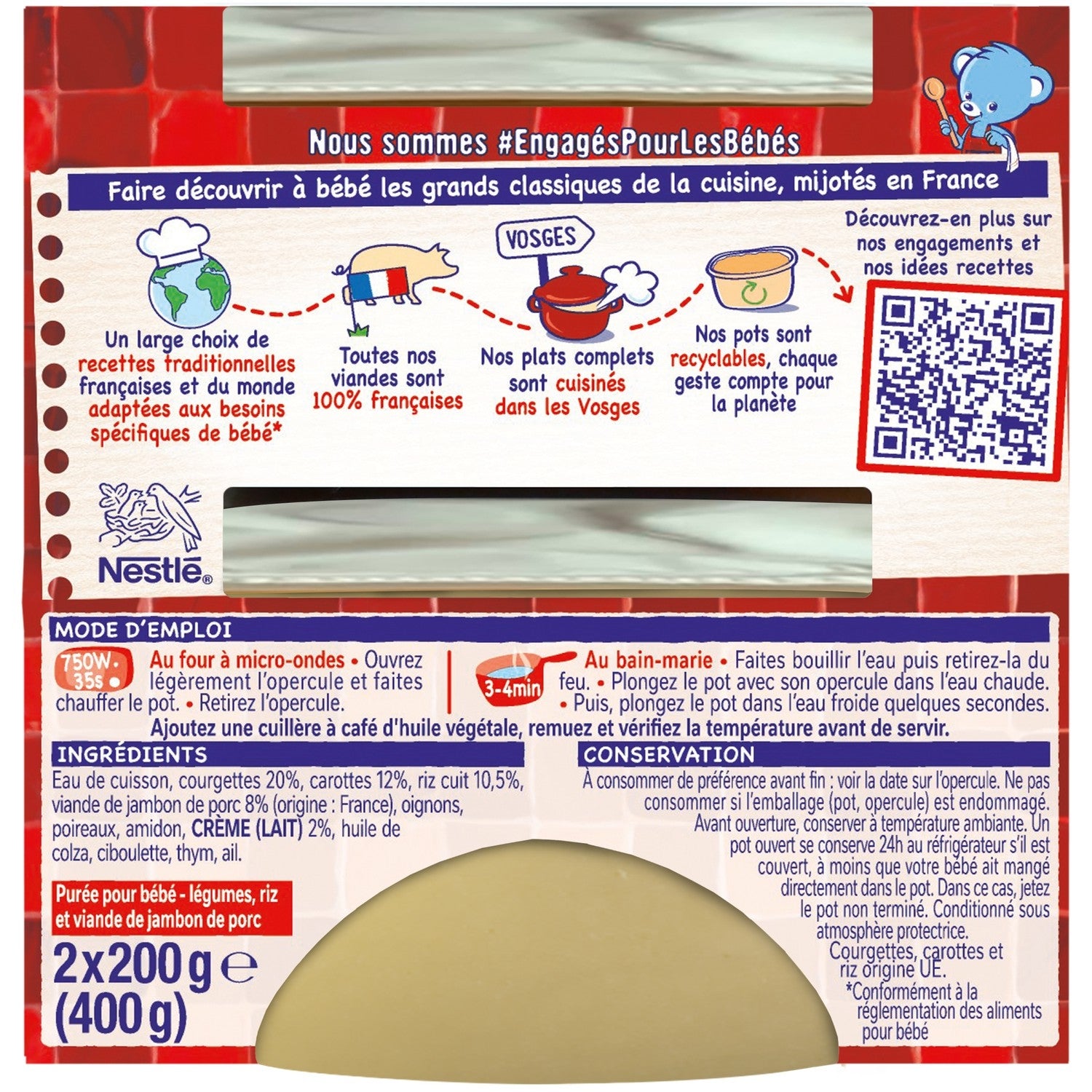 Faites voyager bébé avec NESTLÉ P'tite Recette Risotto Courgettes Carottes Jambon : embarquement pour l'Italie ! Un petit plat mijoté conçu exprès pour bébé* avec des morceaux fondants pour initier bébé à des nouvelles textures. Du riz avec de la crème et des légumes mijotés et parfumés de thym et de ciboulette pour éveiller bébé à de nouvelles saveurs italiennes. Une recette cuisinée en France avec de la viande de porc française. C'est toujours sous la surveillance permanente d'un adulte que votre bébé peut savourer ce plat. Veillez à respecter l'appétit de votre bébé. Courgettes, Carottes, Riz origine UE.