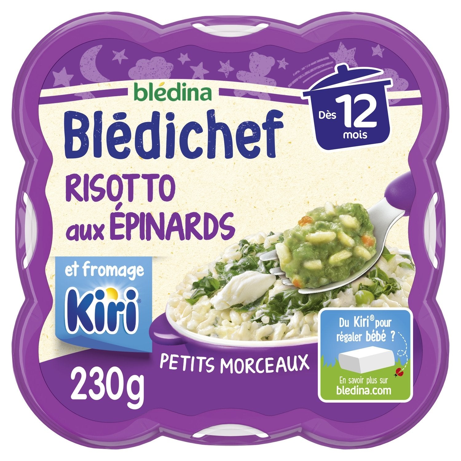 Expert de la diversification alimentaire depuis plus de 100 ans, Blédina vous accompagne pour tous les repas de votre bébé. Notre mission ? Eveiller sa curiosité pour le manger vrai, grâce à plus de 250 recettes conçues par des nutritionnistes et parfaitement adaptées à ses besoins. Blédina Blédichef - Risotto aux Epinards et fromage Kiri® dès 12 mois. L'association des épinards avec la douceur du fromage Kiri® pour un plat BLEDICHEF gourmand qui plaira aux papilles de bébé. Découvrez les petits plats Blédichef® du soir de Blédina : une large gamme de plats savoureux pour le dîner, spécialement élaborés pour régaler votre bébé en toute sérénité et lui faire découvrir chaque jour de nouvelles saveurs ! Du Kiri® pour régaler bébé ? Comme d'autres fromages, il est possible de proposer du fromage Kiri® Original* en quantité adaptée lors de la diversification alimentaire de bébé. Blédina a élaboré une gamme de plats complets du soir au fromage Kiri®, avec une faible teneur en sel, des petits morceaux adaptés, et des ingrédients 100% d'origine naturelle. Retrouvez des recettes ainsi que nos conseils sur bledina.com. *Kiri® Crème