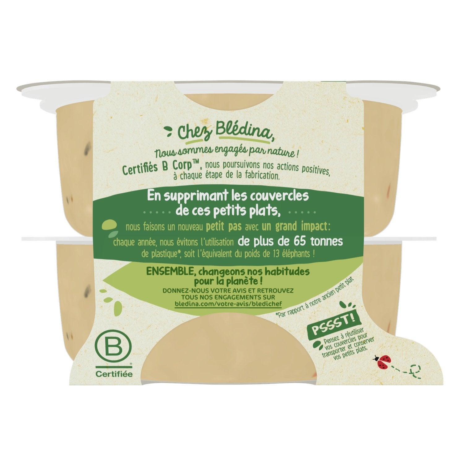 Ce petit plat Blédichef, avec des petits morceaux, est adapté à bébé à partir de 12 mois. Ce petit plat Blédichef est sans couvercle mais pas sans raison ! -40% de plastique* *Par rapport à notre ancien petit plat