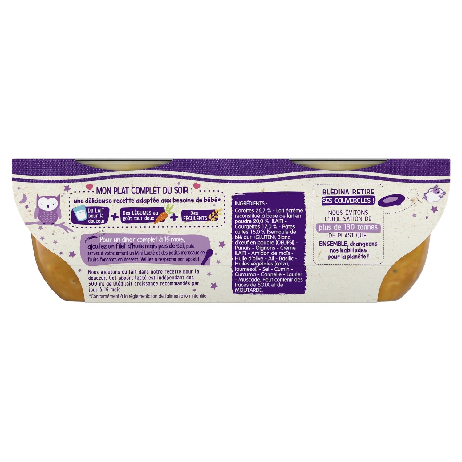 Pour faire de chaque soir une belle histoire, initiez bébé aux notes douces des légumes en lui proposant des bols aux légumes Blédiner.,Mon plat complet du soir : Des LEGUMES au goût tout doux + Du LAIT pour la douceur + DES FECULENTS Le lait, ajouté pour la douceur, est indépendant des 500 ml de Blédilait croissance recommandés par jour.,Faible teneur en sel. Sans résidus de pesticides (Taux inférieurs à 0,000001% conformément à la réglementation infantile.)