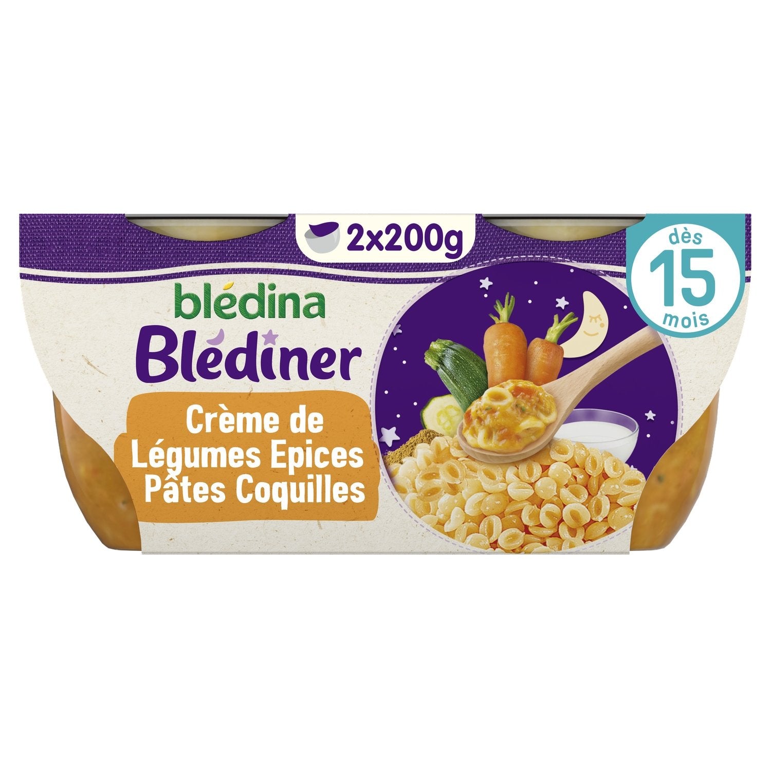 Expert de la diversification alimentaire depuis plus de 100 ans, Blédina vous accompagne pour tous les repas de votre bébé. Notre mission ? Eveiller sa curiosité pour le manger vrai, grâce à plus de 250 recettes conçues par des nutritionnistes et parfaitement adaptées à ses besoins. Blédina Blédiner - Crème de Légumes aux Epices Douces Pâtes Coquilles dès 15 mois. Découvrez ces savoureuses recettes BLEDINA pour le dîner de bébé. Des petits plats bébé à donner à la cuillère qui associent des légumes et des féculents variés, à une touche de lait pour la douceur. Un savoureux plat complet du soir pour bébé !