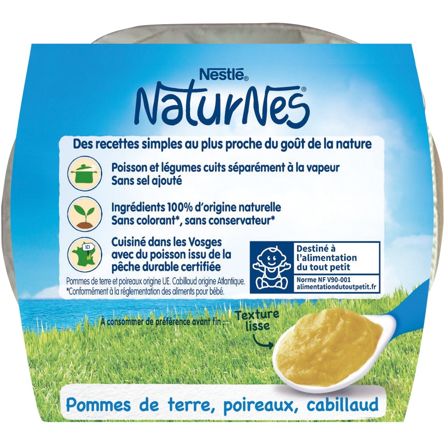 NOUVEAU ! NaturNes® contribue à prendre soin de la nature pour en offrir le meilleur à bébé. Rigoureusement sélectionnés, tous nos ingrédients sont 100% d'origine naturelle, nos légumes sont sélectionnés à maturité et nos poissons sont issus de pêche durable certifiée. Nous préservons par ailleurs les goûts grâce à un mode de cuisson à la vapeur douce. Ainsi, pour la diversification alimentaire de bébé, faites-lui découvrir nos petits pots dès 6 mois, pomme de terre, poireaux, cabillaud, élaborés en France dans les Vosges ! Pommes de terre et poireaux origine UE. Cabillaud origine Atlantique.