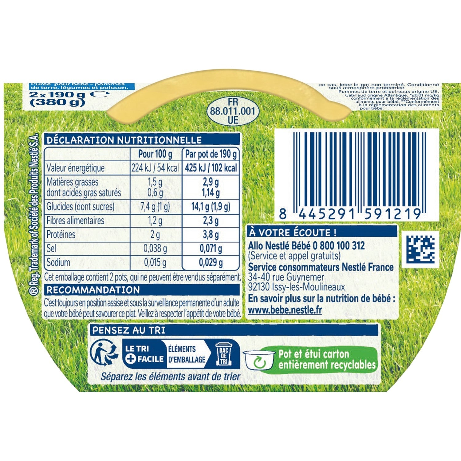 DétailsPurée pour bébé - pommes de terre, légumes et poisson. Poids unitaire : 1140 grs Code-barres EAN : 8445291591219 Marque : NESTLE
