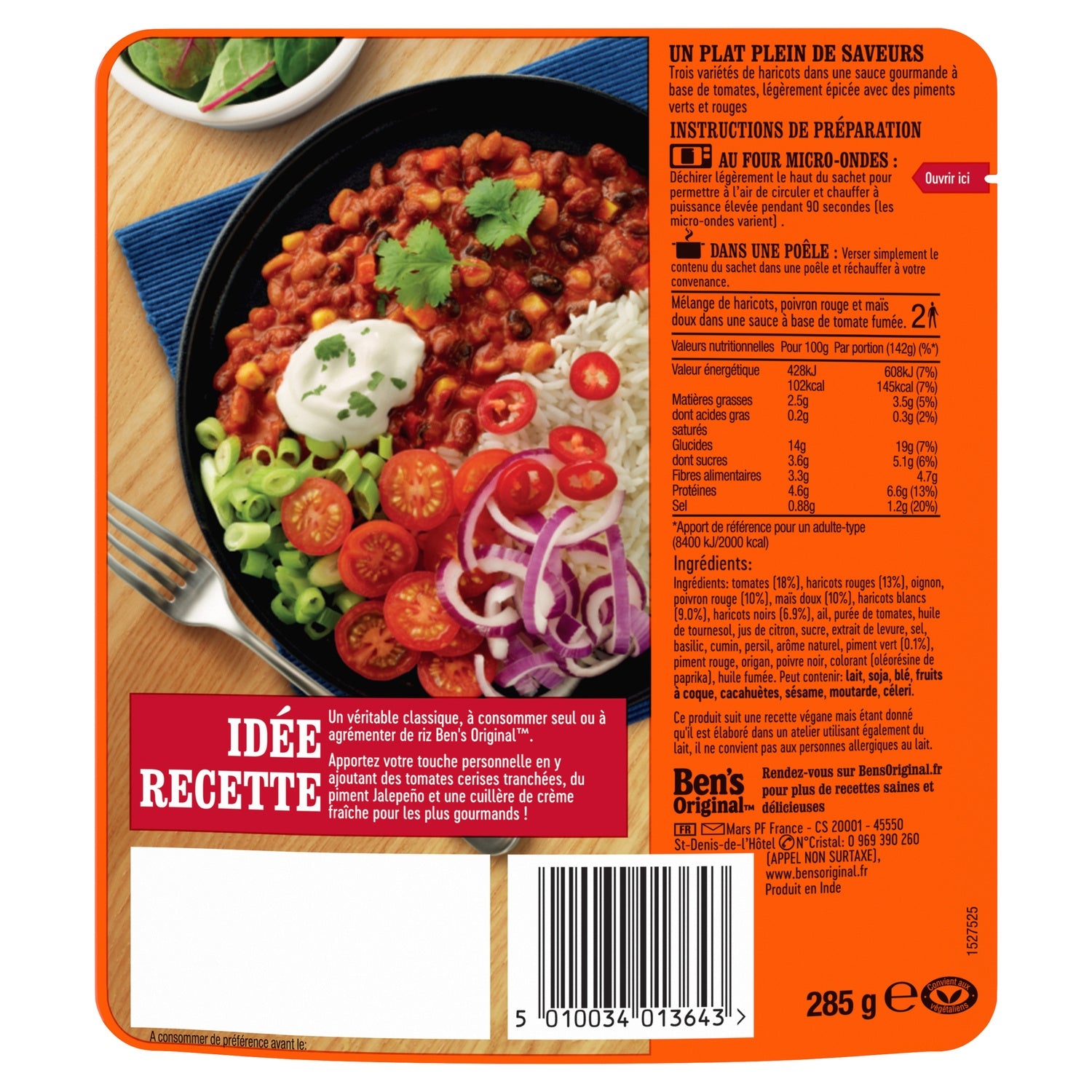 BEN'S ORIGINAL's™ vous propose un plat préparé 100% végétal réunissant trois variétés de haricots dans une sauce gourmande à base de tomate, légèrement épicée avec des piments verts et rouges. Pratique et rapide à préparer : en seulement 90 secondes à la poêle ou aux micro-ondes. Avec ce plat cuisiné, sans colorant, ni arôme, ni conservateur artificiels, vous pouvez créer des repas délicieux et sains à la fois. Cette recette est sources de fibres et protéines et accompagnera parfaitement du riz. Nos plats 100% végétaux express sont disponibles dans trois variétés de saveurs différentes. Nutriscore A