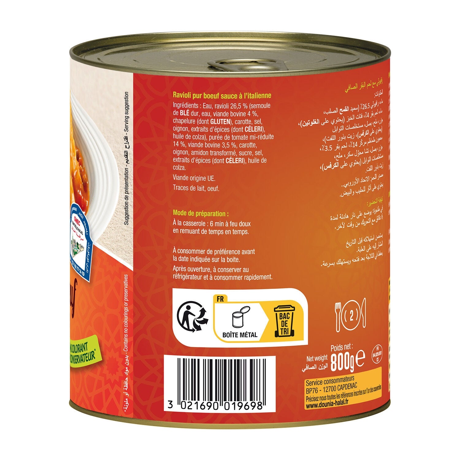 Eau, ravioli 26,5 % (semoule de BLÉ dur, eau, viande bovine 4 %, chapelure (dont GLUTEN), carotte, sel, oignon, extraits d'épices (dont CELERI), huile de colza), purée de tomate mi-réduite 14 %, viande bovine 3,5 %, carotte, oignon, amidon transformé, sucre, sel, extraits d'épices (dont CELERI), huile de colza. Viande origine UE. Traces de LAIT, OEUF.