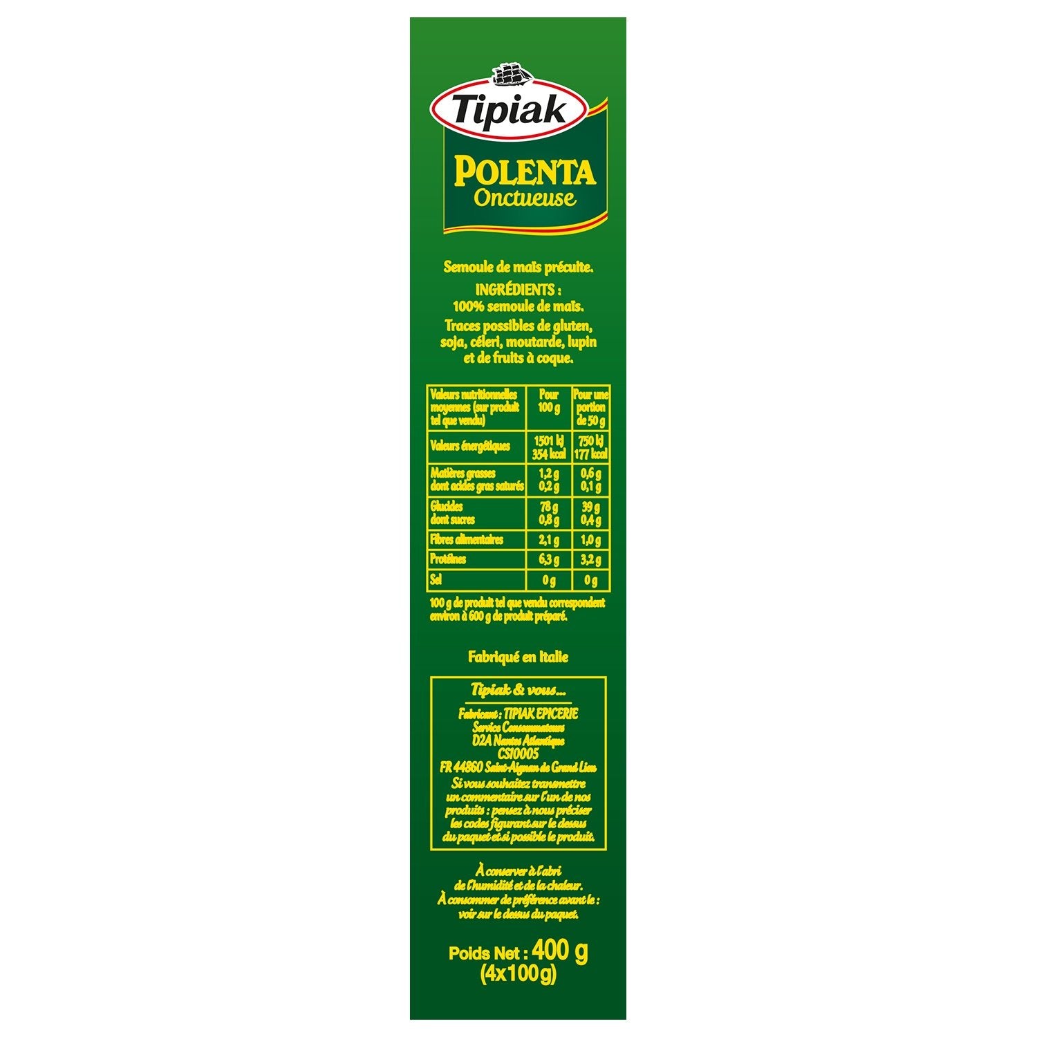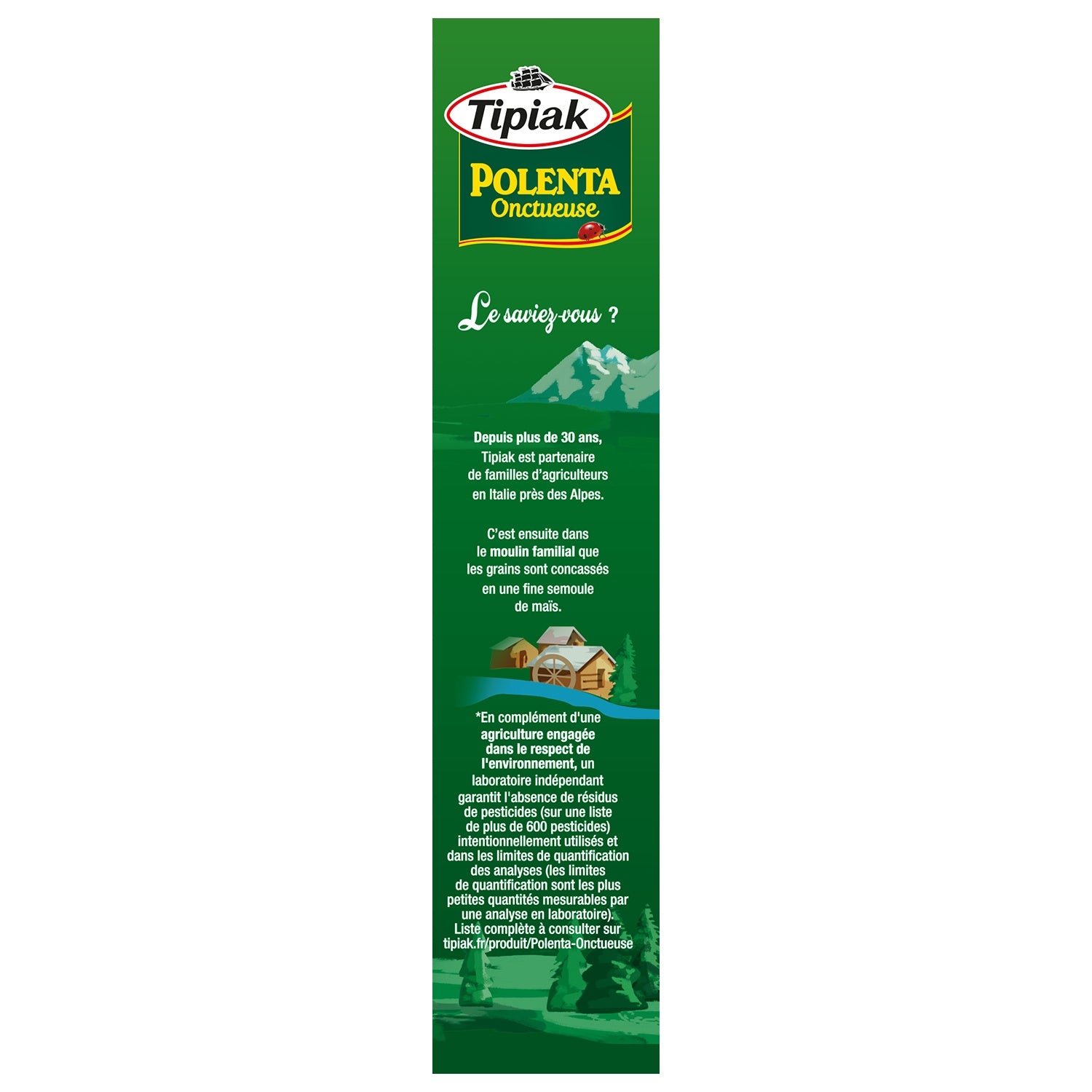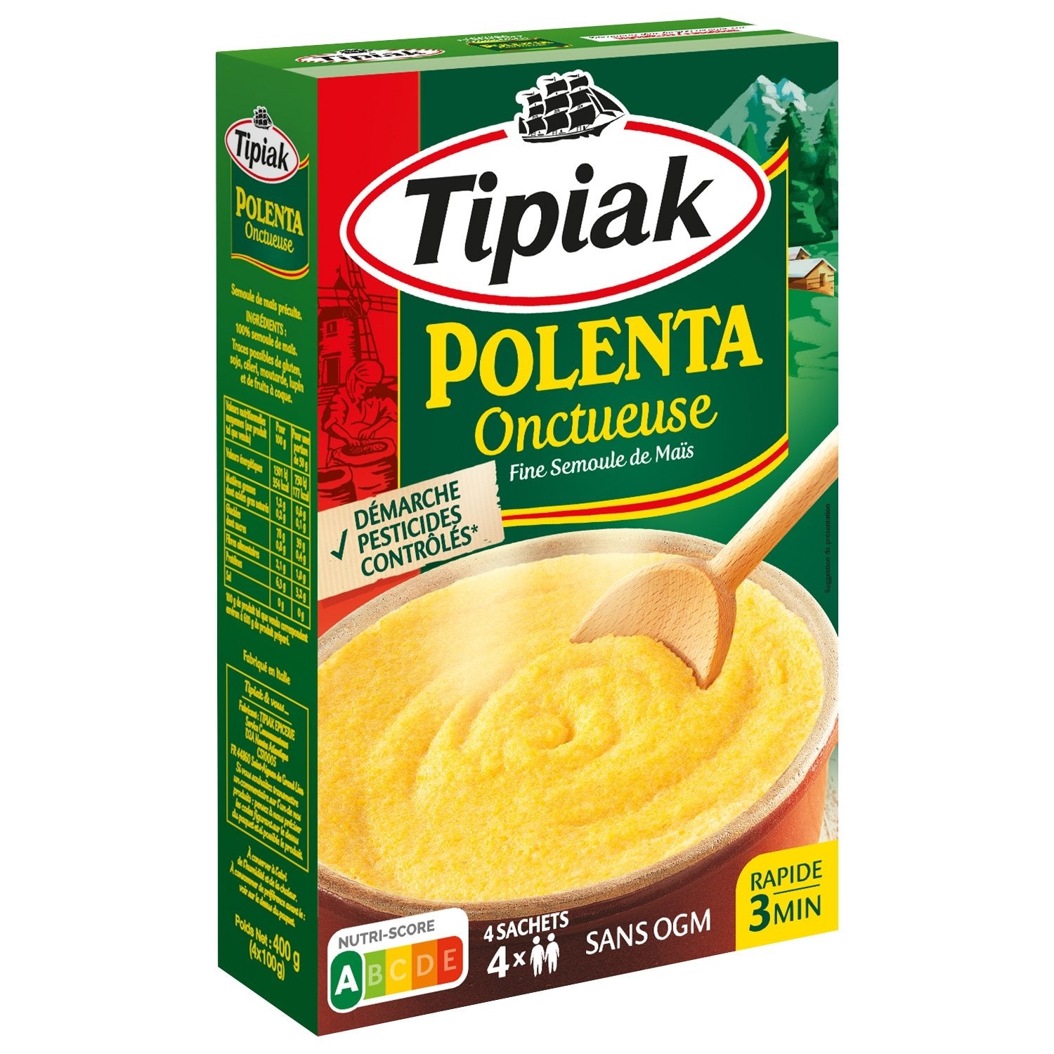 Savourez la Polenta Tipiak encore plus onctueuse : de la fine semoule de maïs et une préparation avec du lait. Si facile à cuisiner que vous pourrez réaliser de nombreuses recettes créatives : toast apéritif, salade et gratin ! Le saviez-vous ? Depuis plus de 30 ans, Tipiak est partenaire de familles d'agriculteurs en Italie près des Alpes. C'est ensuite dans le moulin familial que les grains sont concassés en une fine semoule de maïs. En complément d'une agriculture engagée dans le respect de l'environnement, un laboratoire indépendant garantit l'absence de résidus de pesticides après récolte dans les limites de quantification.