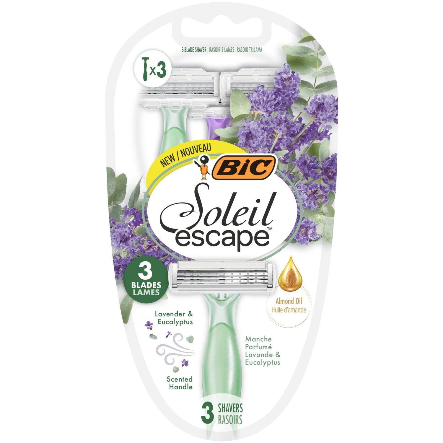 Pack de 3 rasoirs pour femmes BIC Soleil Escape 3 Lames Lavande & Eucalyptus avec 3 lames mobiles durables et une glisse optimale,Profitez d'une meilleure expérience de rasage grâce au grip et au manche incurvé de ce rasoir parfumé à la lavande et à l'eucalyptus,Avec sa tête pivotante qui épouse toutes les courbes de votre corps, le rasoir BIC Soleil Escape est cliniquement prouvé pour peaux sensibles,Enrichie en huile d'amande douce, la bande lubrifiante améliore votre expérience pour un rasage tout en douceur et sans effort,Selon vos envies et vos humeurs, choisissez entre deux couleurs de manche : violet lavande et vert eucalyptus