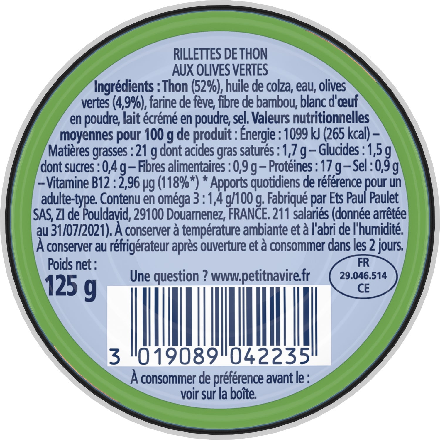 THON (50%), huile de colza, eau, olives vertes (5%), fibres végétales, blanc d'OEUF en poudre, protéines de LAIT, arômes, sel, épaississants: carraghénanes et farine de graines de caroube.