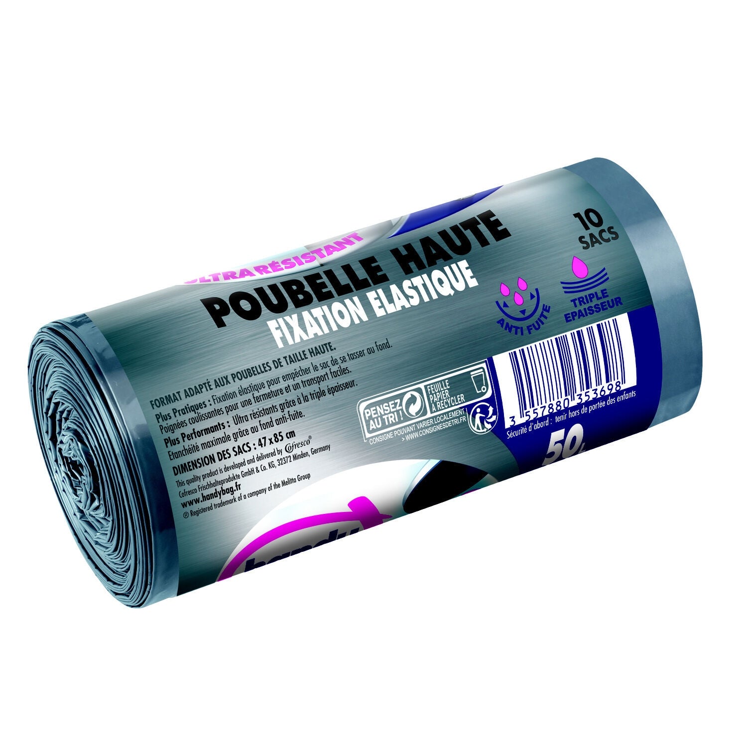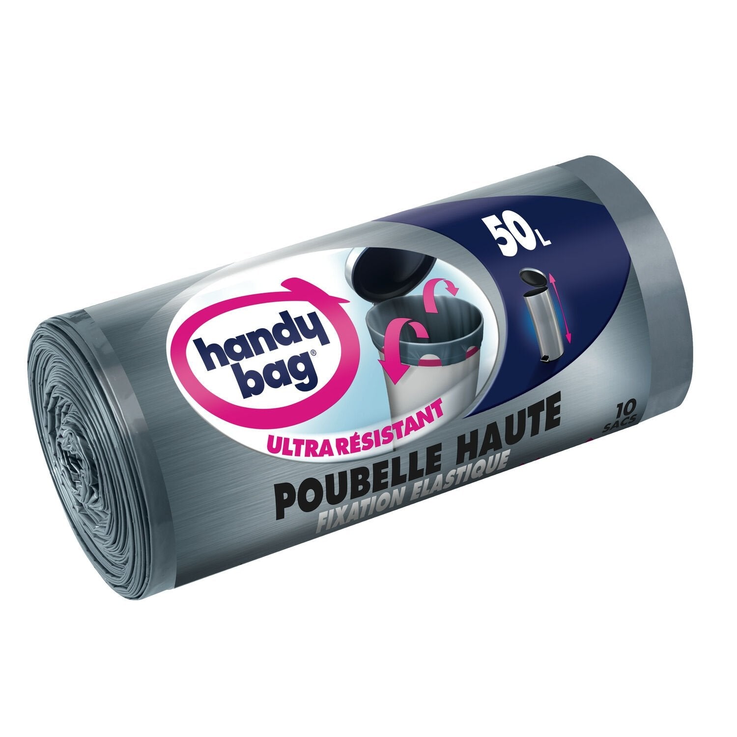 DétailsHANDY BAG sacs pour POUBELLE HAUTE FIXATION ELASTIQUE à poignées coulissantes 50 L Poids unitaire : 328 grs Code-barres EAN : 3557880353698 Marque : HANDY BAG