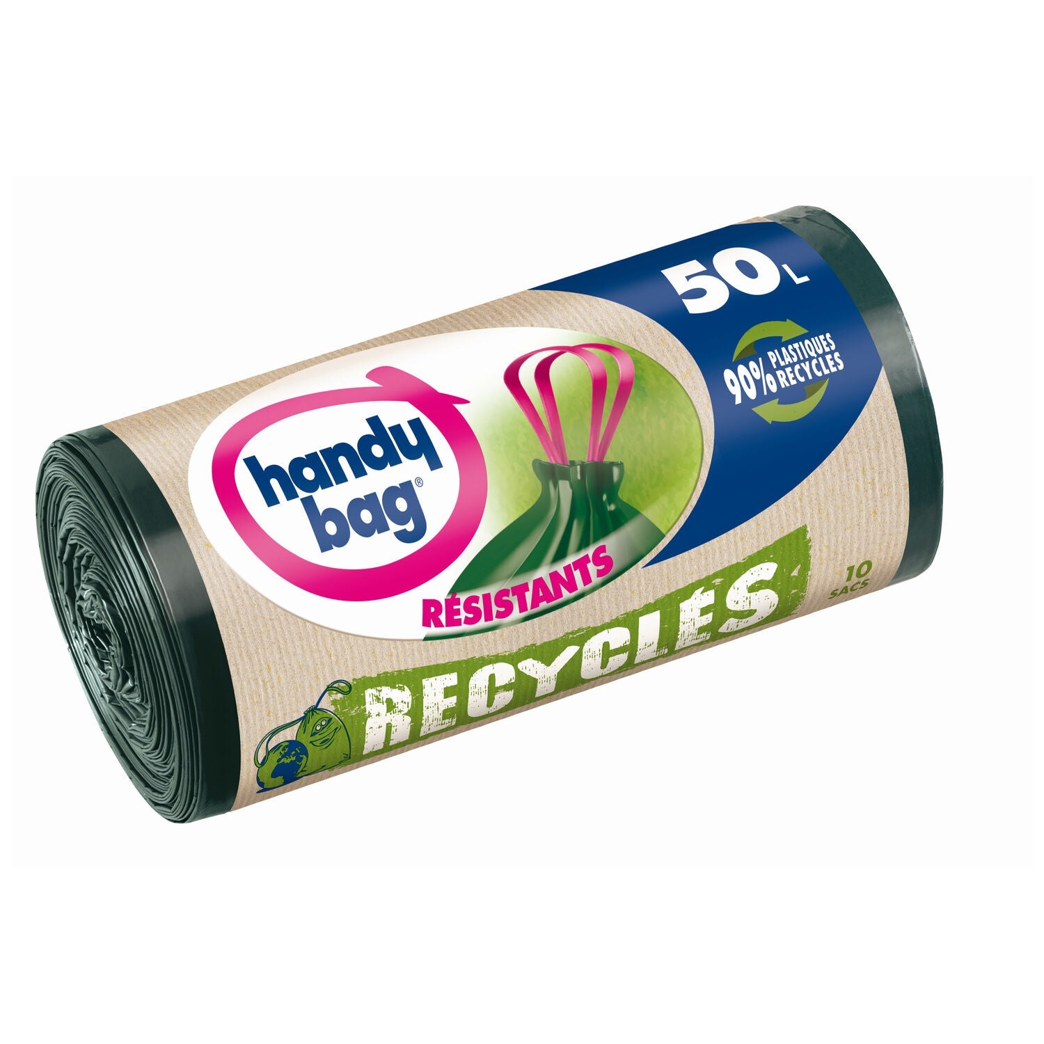 DétailsHANDY BAG sacs poubelle RECYCLES à poignées coulissantes 50 L Poids unitaire : 279 grs Code-barres EAN : 3557880400064 Marque : HANDY BAG