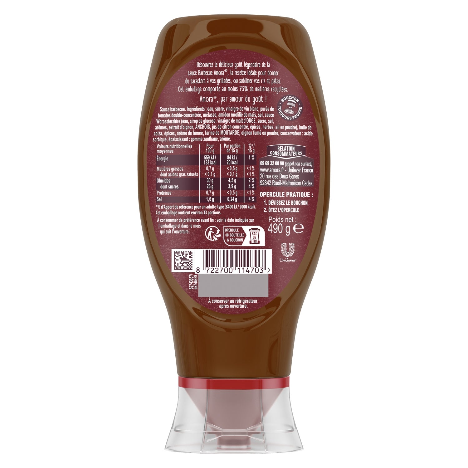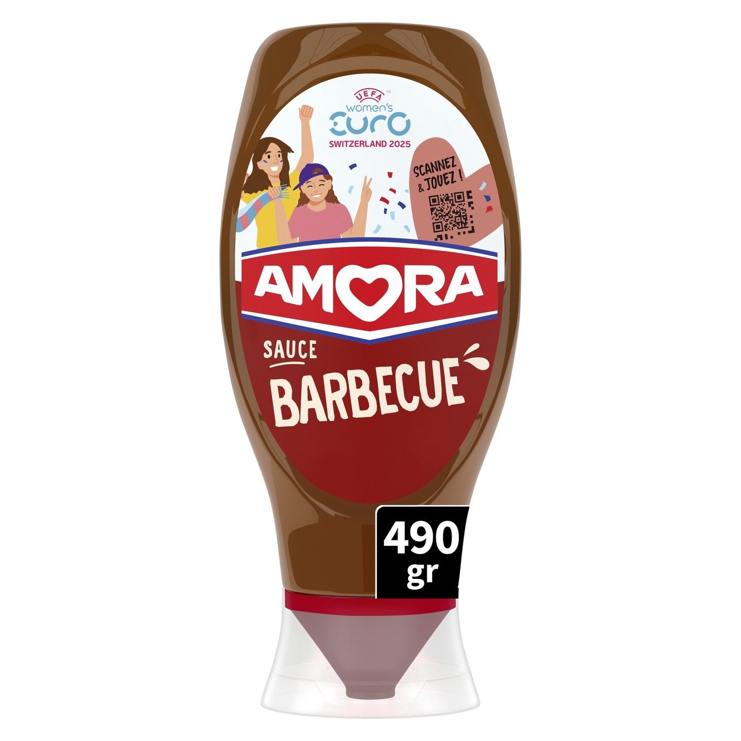Tous champions du barbecue ! Édition limitée Amora® UEFA WOMEN'S EURO 2025™, célébrant Amora® en tant que partenaire officiel BBQ de l'UEFA WOMEN'S EURO 2025™.,L'iconique sauce barbecue au goût intense et fumé.,Régalez-vous avec la recette inimitable de sauce Barbecue Amora®.,Une recette gourmande qui plaira aux petits comme aux grands, pour profiter d'un barbecue l'été en famille ! Avec la sauce Barbecue Amora ®, partagez plus qu'un repas !,Sublimez vos viandes, burgers et poissons grillés avec le goût surprenant de la sauce Barbecue Amora® !,Parce qu'il est important pour nous de limiter notre impact environnemental, l'emballage de notre sauce Barbecue comporte au moins 73% de matières recyclées.