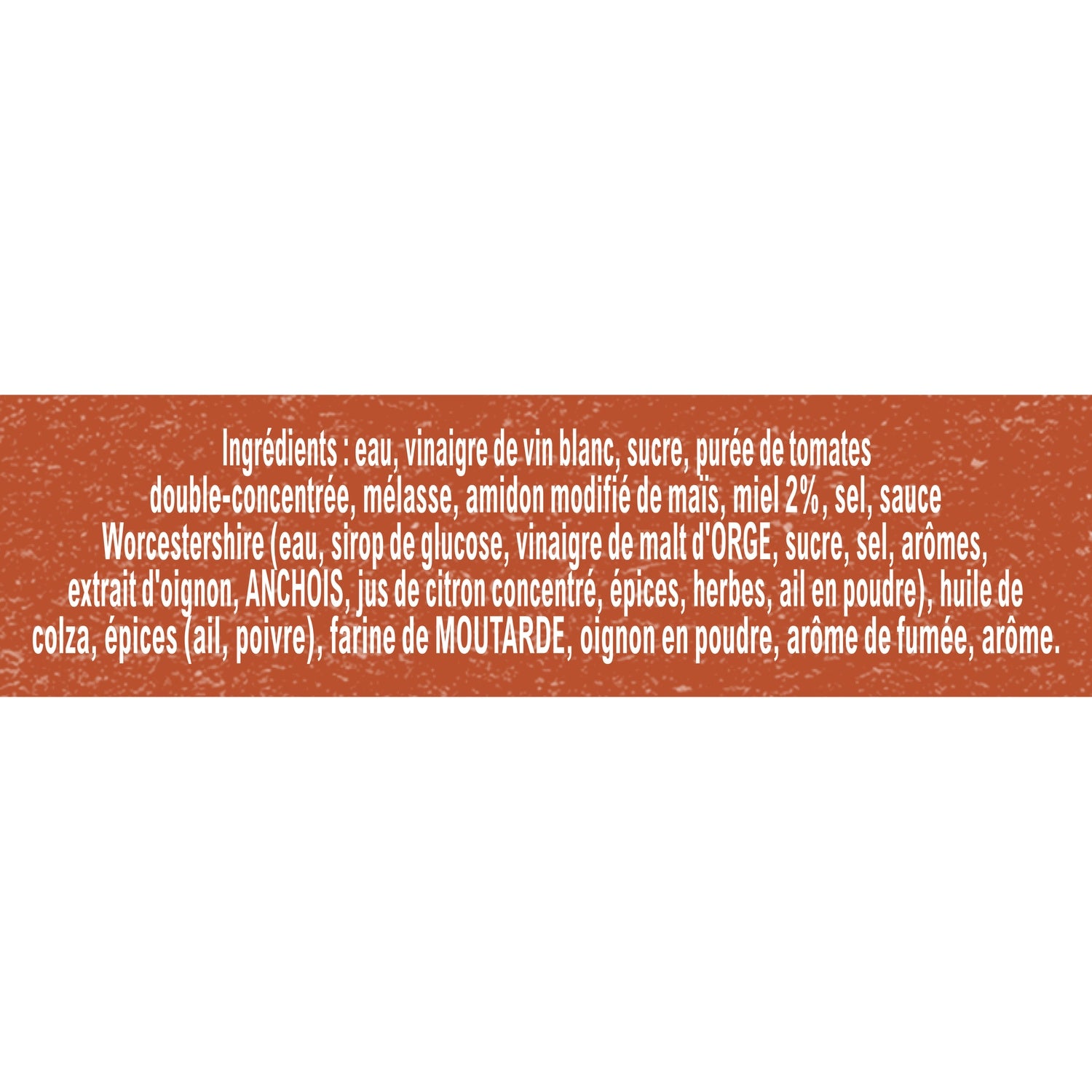 Ingrédients : eau, vinaigre de vin blanc, sucre, purée de tomates double-concentrée, mélasse, amidon modifié de maïs, miel 2%, sel, sauce Worcestershire (eau, sirop de glucose, vinaigre de malt d'ORGE, sucre, sel, arômes, extrait d'oignon, ANCHOIS, jus de citron concentré, épices, herbes, ail en poudre), huile de colza, épices (ail, poivre), farine de MOUTARDE, oignon en poudre, arôme de fumée, arôme.