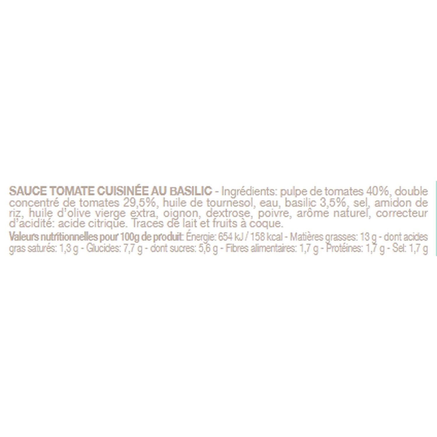 Ingrédients : pulpe de tomate 40%, double concentré de tomate 29.5%, huile de tournesol, eau, basilic 3.5%, sel, amidon de riz, huile d'olive vierge extra 1%, oignon, dextrose, poivre, arôme naturel, correcteur d'acidité: acide citrique.