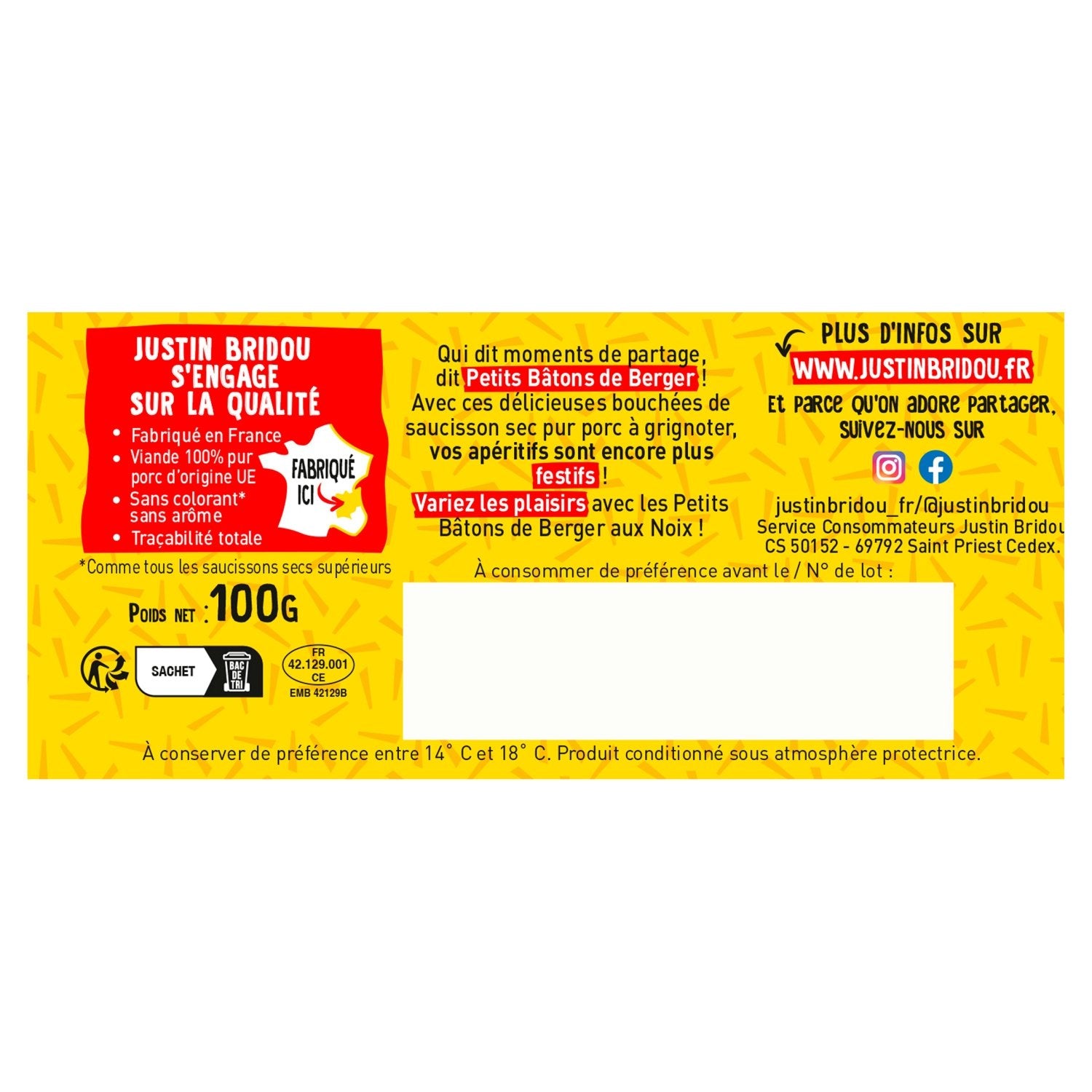 De délicieuses bouchées de saucisson sec Nature, idéales pour l'apéritif. Justin Bridou réinvente l'apéritif avec des délicieuses bouchées de saucisson sec nature : les Petits Bâtons de Berger. Savoureux, gourmands et ludiques, les Petits Bâtons de Berger possèdent un vrai sens de la fête et sauront apporter sourires et éclats de rire à vos apéritifs Son format généreux est idéal à partager entre amis ou en famille.