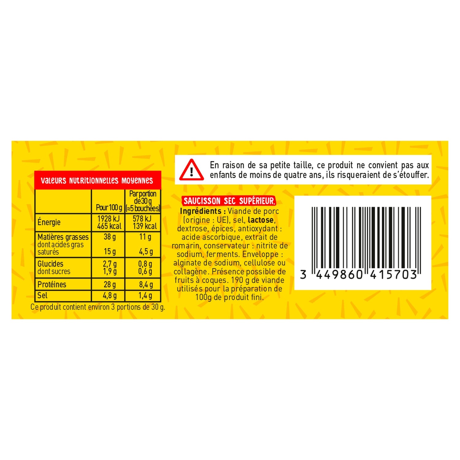 Ingrédients : Ingrédients : Viande de porc (origine : UE), sel, LACTOSE, dextrose, épices, antioxydant : acide ascorbique, extrait de romarin, conservateur : nitrite de sodium, ferments. Enveloppe : alginate de sodium, cellulose ou collagène. Présence possible de FRUITS A COQUES. 185g de viande utilisés pour la préparation de 100g de produit fini.