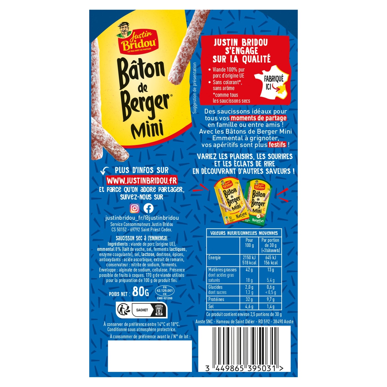 Justin Bridou réinvente l'apéritif avec les Bâtons de Berger Mini : de délicieux bâtonnets de saucisson sec à l'emmental, qui se picorent avec plaisir, en famille ou entre amis.