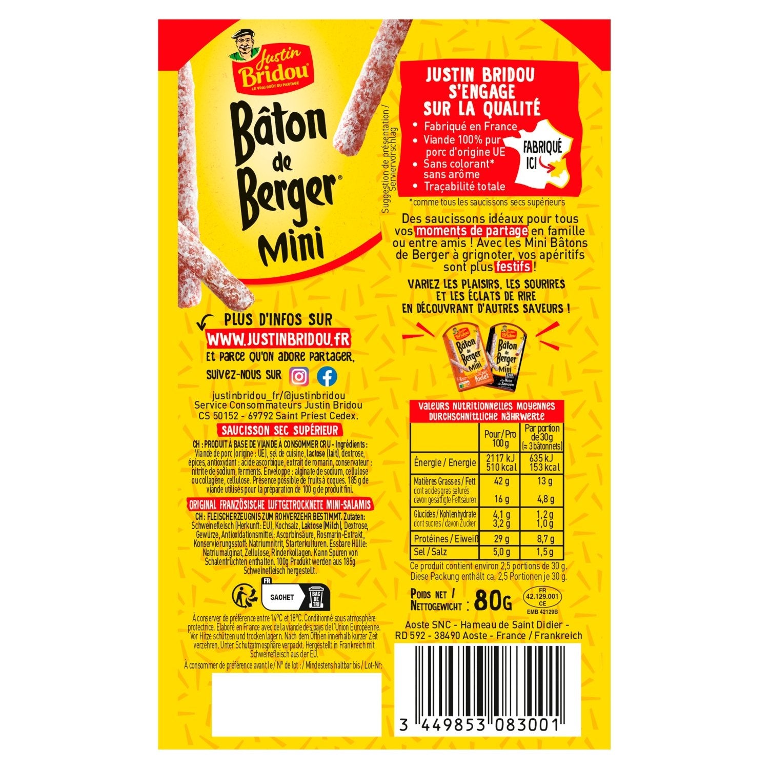 De délicieux bâtonnets de saucisson sec Nature, idéaux pour l'apéritif. Toujours aussi savoureux et gourmands, les Bâtons de Berger Mini possèdent un vrai sens de la fête et sauront apporter sourires et éclats de rire à vos apéritifs.