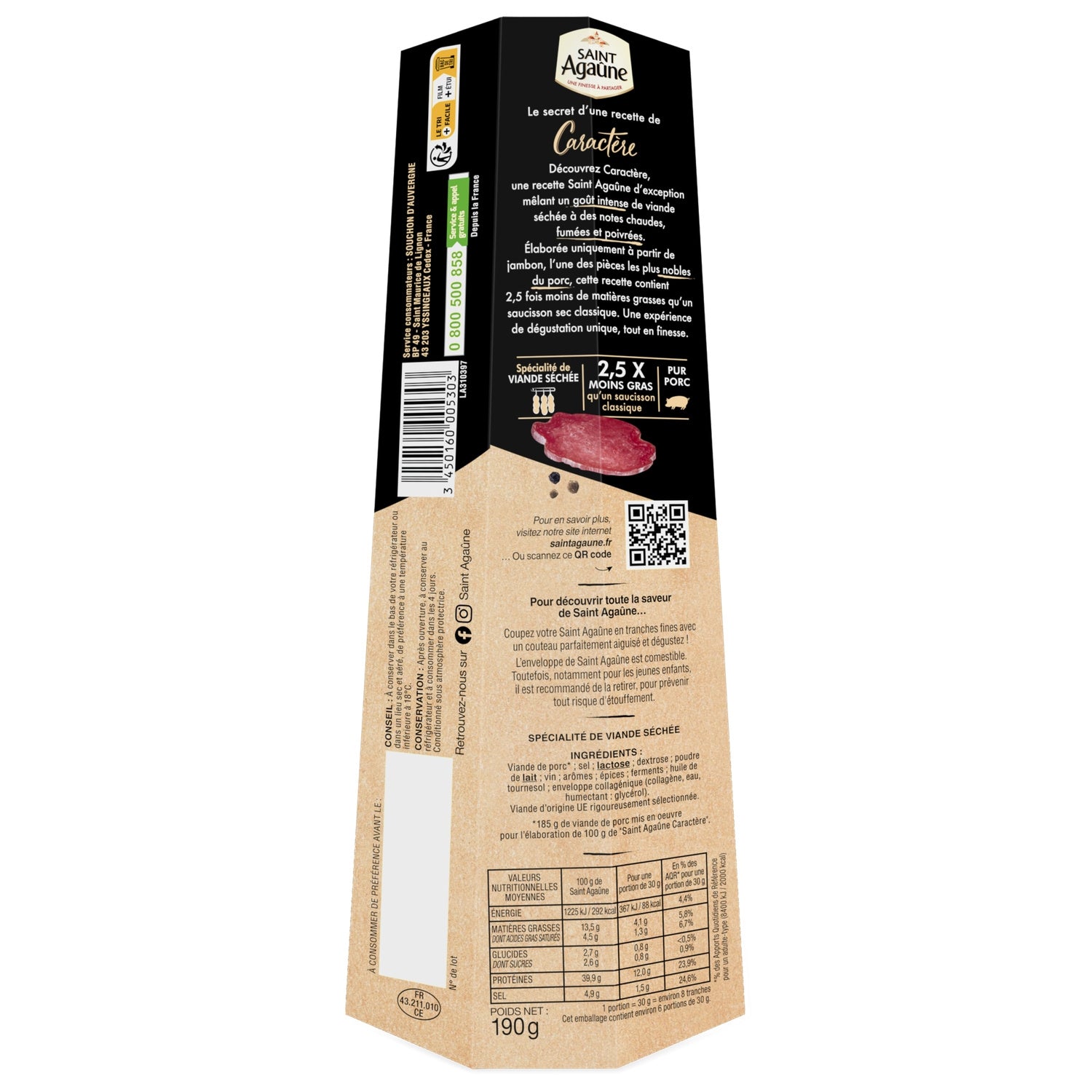 Découvrez Caractère, une recette de Saint Agaûne d'exception mêlant un goût intense de viande séchée à des notes chaudes, fumées et poivrées. Élaborée uniquement à partir de jambon, l'une des pièces les plus nobles du porc, cette recette contient 2 fois moins de matières grasses qu'un saucisson sec classique.