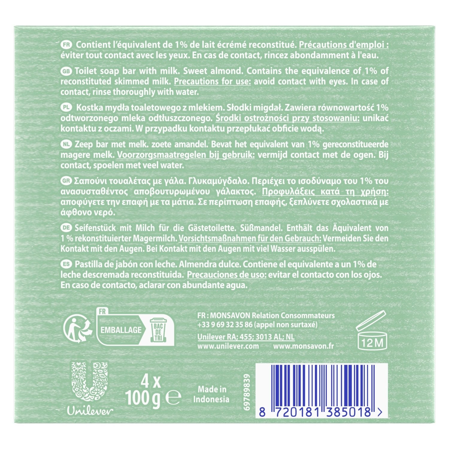 Découvrez le nouveau savon nourrisant Amande douce Monsavon au lait. Sa formule, composée de 95% d'ingrédients d'origine naturelle, nourrit la peau en douceur. Son parfum au subtiles notes d'amande douce, laisse la peau douce, propre et délicatement parfumée. Adapté à un usage quotidien, notre savon solide Amande douce peut être utilisé pour le corps et les mains. Format 4x100g. Notre recette Amande douce: un savoir faire unique, une base lavante d'origine végétale, et une fabrication à l'ancienne.