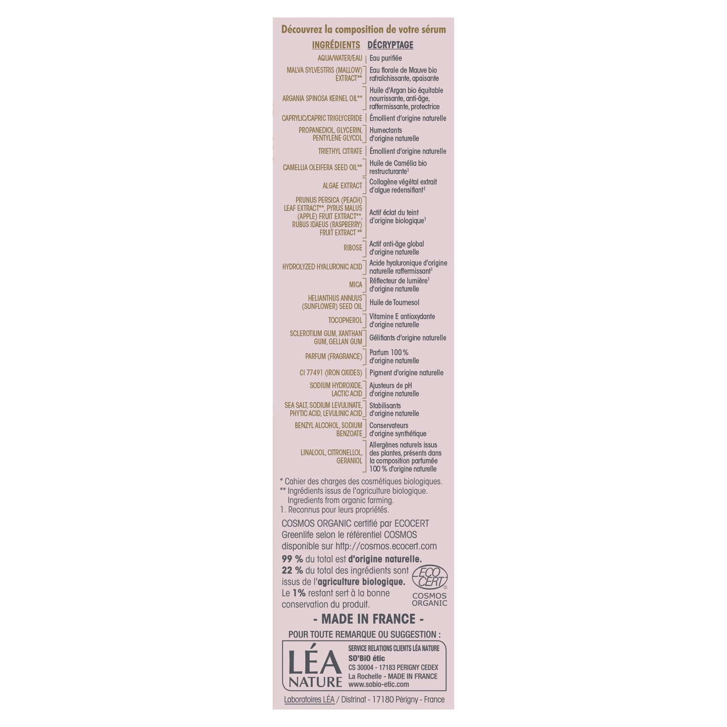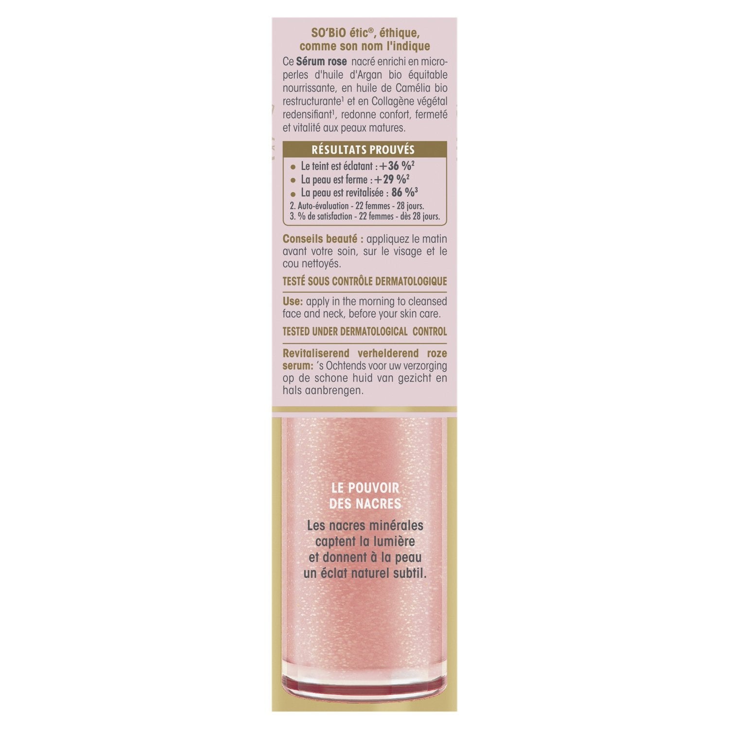SO'BiO étic® crée la gamme Précieux Argan PEAUX MATURES pour répondre aux exigences de confort, de densité et de vitalité des peaux fragilisées et affinées par l'âge. Une association unique d'actifs reconnus pour leur richesse naturelle : l'huile d'Argan bio équitable nourrissante, associée à l'huile de Camélia bio restructurante1 et au Collagène végétal redensifiant1. 1. Reconnus pour leurs propriétés. Ce Sérum rose nacré enrichi en micro-perles d'huiles aux propriétés raffermissantes et restructurantes redonne fermeté et vitalité aux peaux matures. Sa texture perlée fluide, fondante et hautement sensorielle apporte du confort à la peau. Elle retrouve un éclat naturel et subtil grâce aux nacres minérales d'origine naturelle. SO'BiO étic® a sélectionné une huile d'Argan biologique et labélisée équitable issue du Maroc, dans son terroir originel. Son achat garantit une juste rétribution des travailleurs et contribue à l'amélioration de leurs conditions de vie.