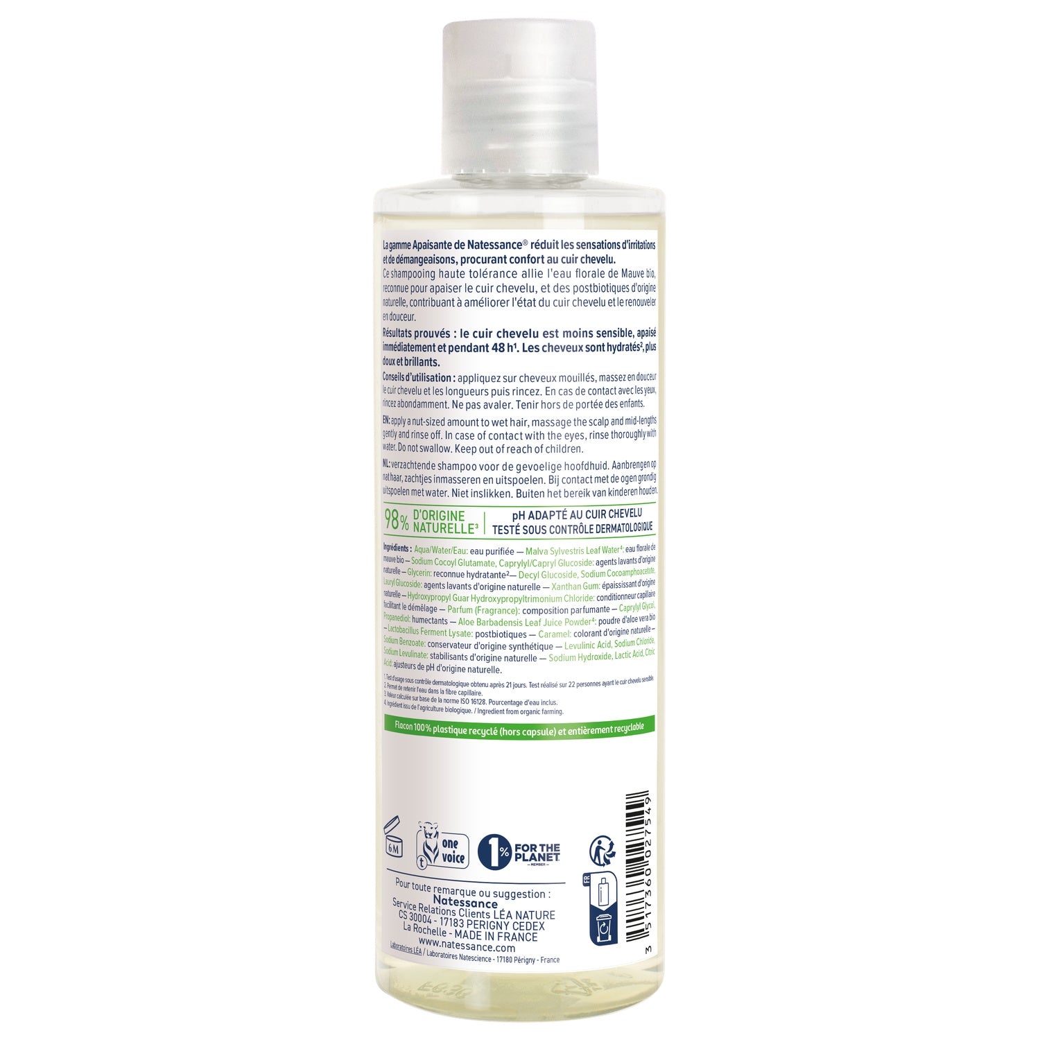 La gamme Apaisante de Natessance® réduit les sensations d'irritations et de démangeaisons, procurant confort au cuir chevelu. Ce shampooing haute tolérance allie l'eau florale de Mauve bio, reconnue pour apaiser le cuir chevelu, et des postbiotiques d'origine naturelle, contribuant à améliorer l'état du cuir chevelu et le renouveler en douceur. Résultats prouvés : le cuir chevelu est moins sensible, apaisé immédiatement et pendant 48 h1. Les cheveux sont hydratés, plus doux et brillants. Ce shampooing apaisant haute tolérence réduit les sensations d'irritations et de démangeaisons, procurant confort au cuir chevelu immdiatement et pendant 48h. 98% d'origine naturelle Apaisement immédiat et pendant 48h Réduit les sensations d'irritations, les démangeaisons et les rougeurs 0% sulfate, silicone, dérivés d'huile de palme Testé sous contrôle dermatologique pH adapté aux cheveux Flacon 100% recyclé et recyclable (hors capsule)