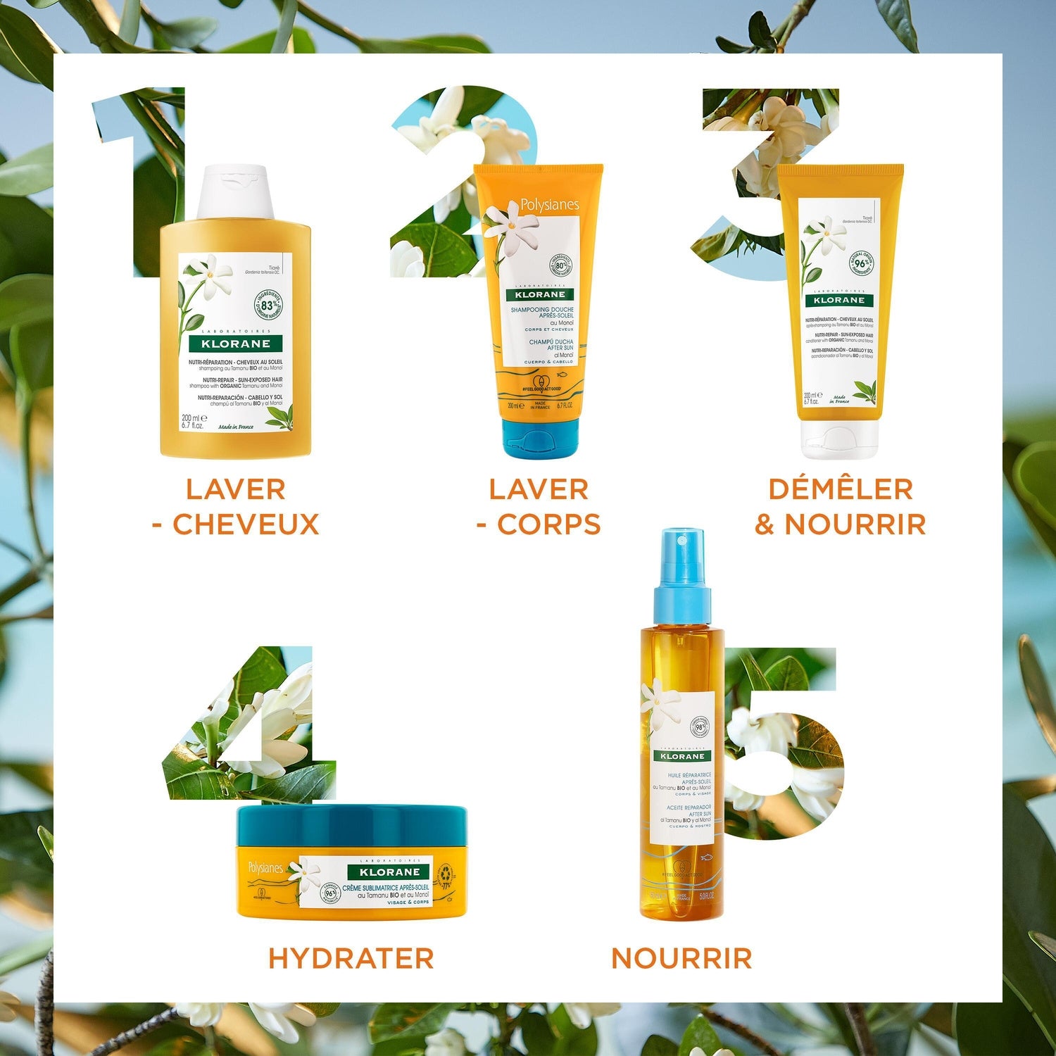 Nutritif, le Shampoing Monoï de Klorane protège et répare les cheveux après la plage ou la piscine. La formule douce, biodégradable et naturelle**, nettoie sans abîmer. Les cheveux sont propres, nourris et réparés, instantanément plus doux*. Un parfum ensoleillé de Fleurs de Tiaré vient éveiller les sens. Pour un rituel complet, utilisez le Baume riche réparateur au Tamanu BIO et au Monoï. *91% de satisfaction (test d'usage consommateurs, 94 personnes après 21 jours d'utilisation). **Formule à 83 % d'ingrédients naturels.