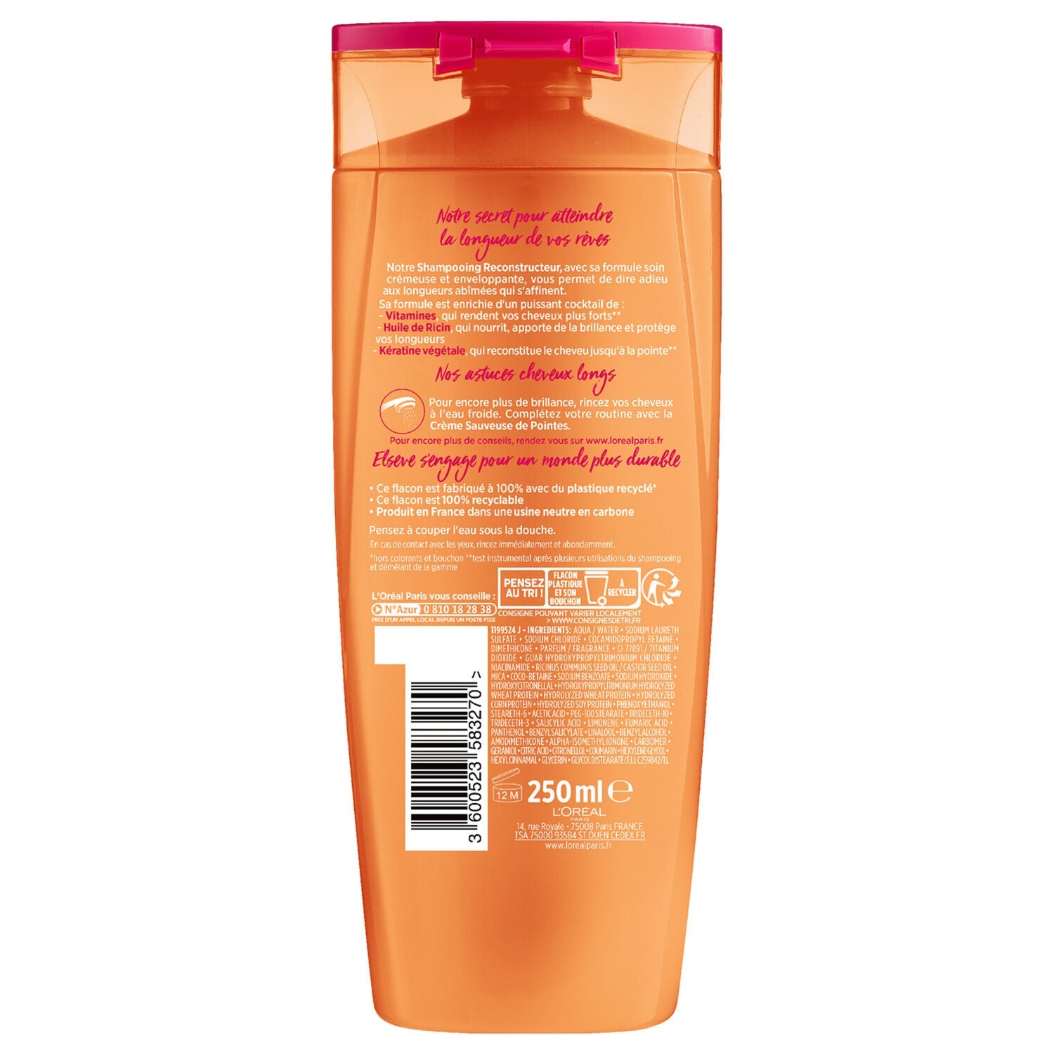 Shampoing Reconstructeur pour Cheveux Abimés, Cassants ou Longs, enrichi en Huile de Ricin, Vitamines et Kératine Végétale pour réparer intensément vos longueurs sans les alourdir !|• Flacon en plastique 100% recyclé* et recyclable|• Fabriqué en France|*hors colorants et bouchon. Nettoie et répare intensément vos longueurs des racines jusqu'aux pointes pour des cheveux toujours plus longs !